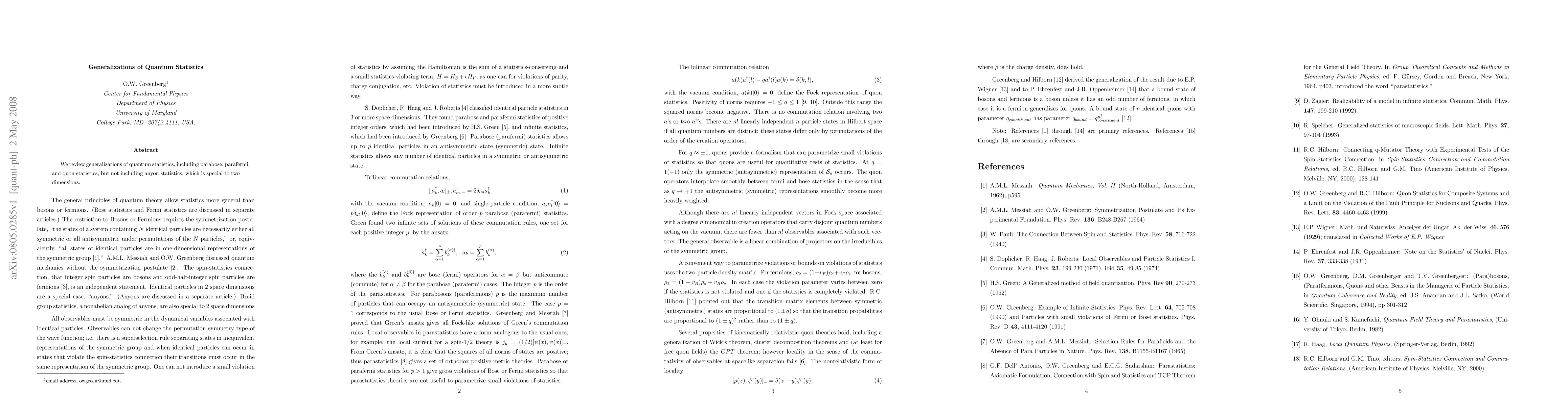 We review generalizations of quantum statistics, including parabose, parafermi, and quon statistics, but not including anyon statistics, which is special to two dimensions.