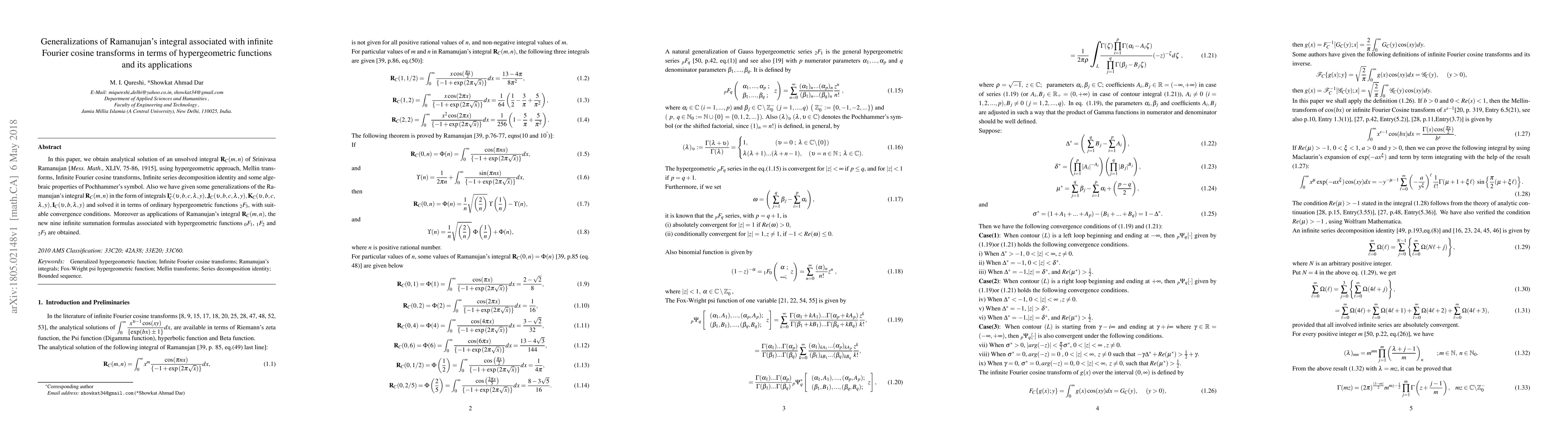In this paper, we obtain analytical solution of an unsolved integral $\textbf{R}_{C}(m,n)$ of Srinivasa Ramanujan [$\textit{Mess. Math}$., XLIV, 75-86, 1915], using hypergeometric approach, Mellin transforms, Infinite Fourier cosine transforms, Infinite series decomposition identity and some algebraic properties of Pochhammer's symbol. Also we have given some generalizations of the Ramanujan's integral $\textbf{R}_{C}(m,n)$ in the form of integrals $\textbf{I}^{*}_{C}(\upsilon,b,c,\lambda,y), \textbf{J}_C (\upsilon,b,c,\lambda,y), \textbf{K}_{C} (\upsilon,b,c, \lambda,y), \textbf{I}_{C}(\upsilon,b,\lambda,y)$ and solved it in terms of ordinary hypergeometric functions ${}_2 F_3$, with suitable convergence conditions. Moreover as applications of Ramanujan's integral $\textbf{R}_{C}(m,n)$, the new nine infinite summation formulas associated with hypergeometric functions ${}_{0}F_{1}$, ${}_{1}F_{2}$ and ${}_{2}F_{3}$ are obtained.