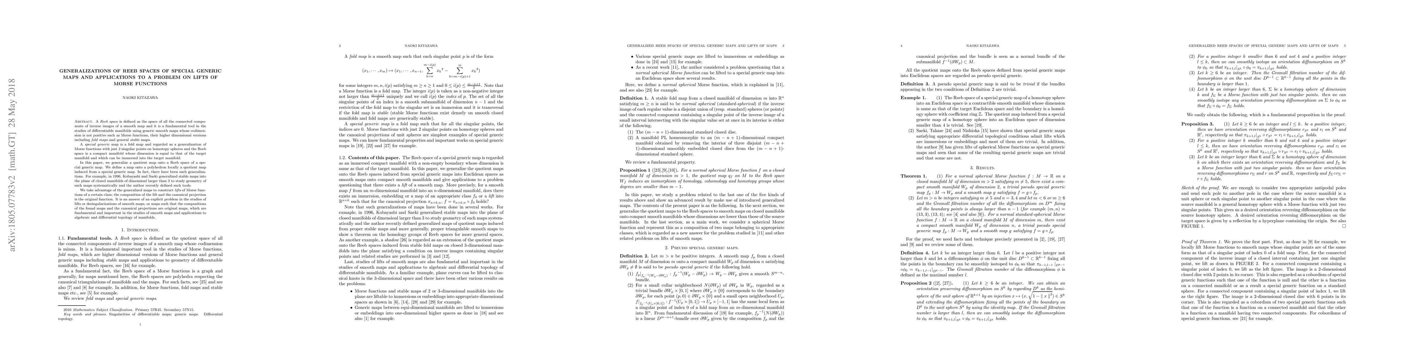 This paper generalizes Reeb spaces of special generic maps, specifically fold maps, and constructs lifts of certain Morse functions. The work provides a solution to a problem regarding the existence of such lifts, which is crucial for the study of smooth maps and their applications in algebraic and differential topology.