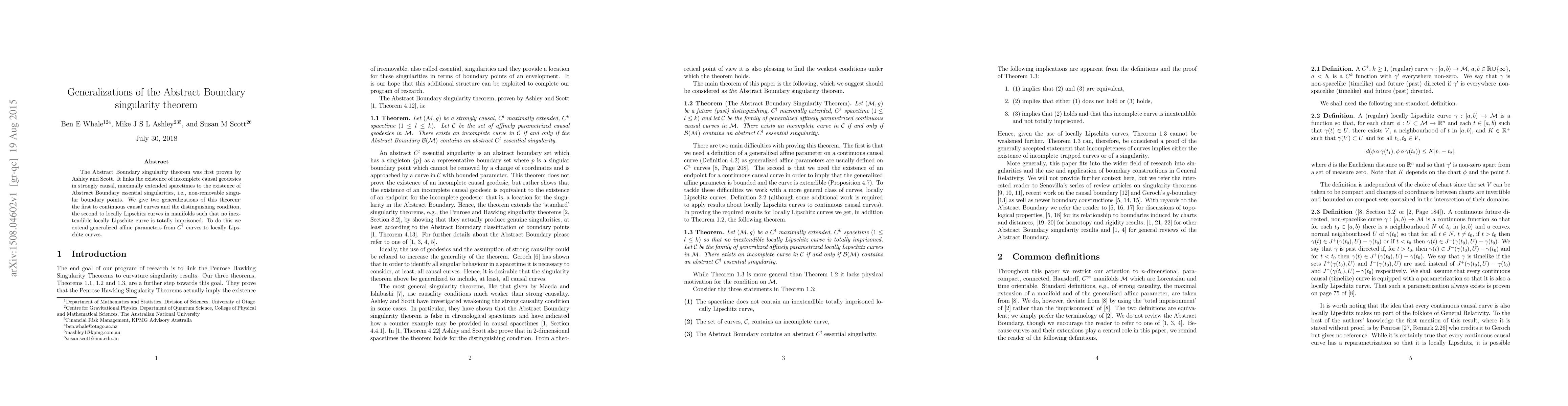 The Abstract Boundary singularity theorem was first proven by Ashley and Scott. It links the existence of incomplete causal geodesics in strongly causal, maximally extended spacetimes to the existence of Abstract Boundary essential singularities, i.e., non-removable singular boundary points. We give two generalizations of this theorem: the first to continuous causal curves and the distinguishing condition, the second to locally Lipschitz curves in manifolds such that no inextendible locally Lipschitz curve is totally imprisoned. To do this we extend generalized affine parameters from $C^1$ curves to locally Lipschitz curves.