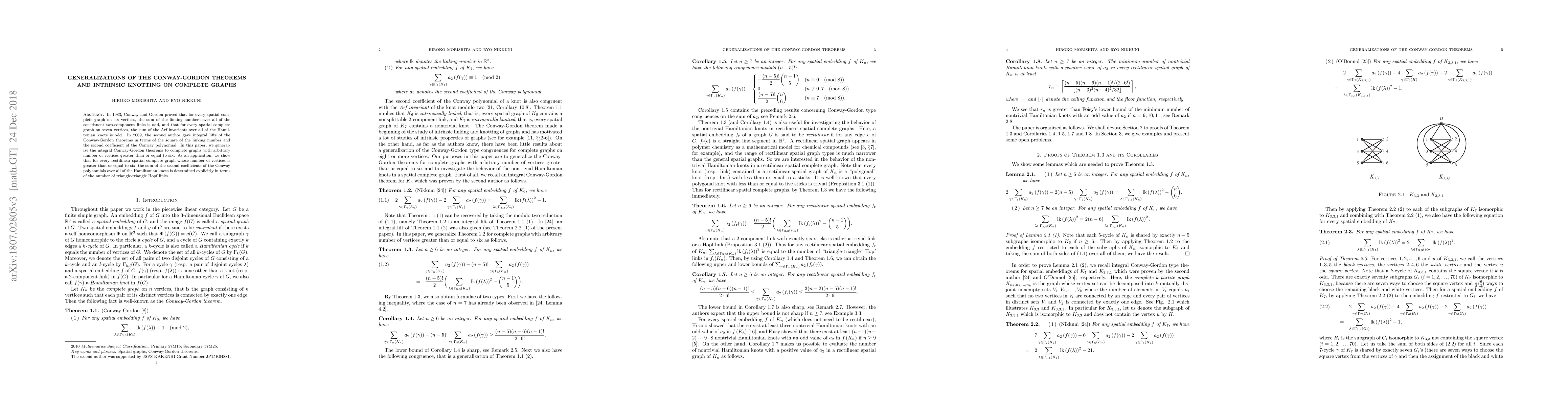 This paper generalizes Conway and Gordon's theorems on spatial complete graphs, proving that for any complete graph with six or more vertices, the sum of certain invariants is odd. It also explicitly determines the sum of Conway polynomial coefficients for rectilinear spatial complete graphs in terms of triangle-triangle Hopf links.