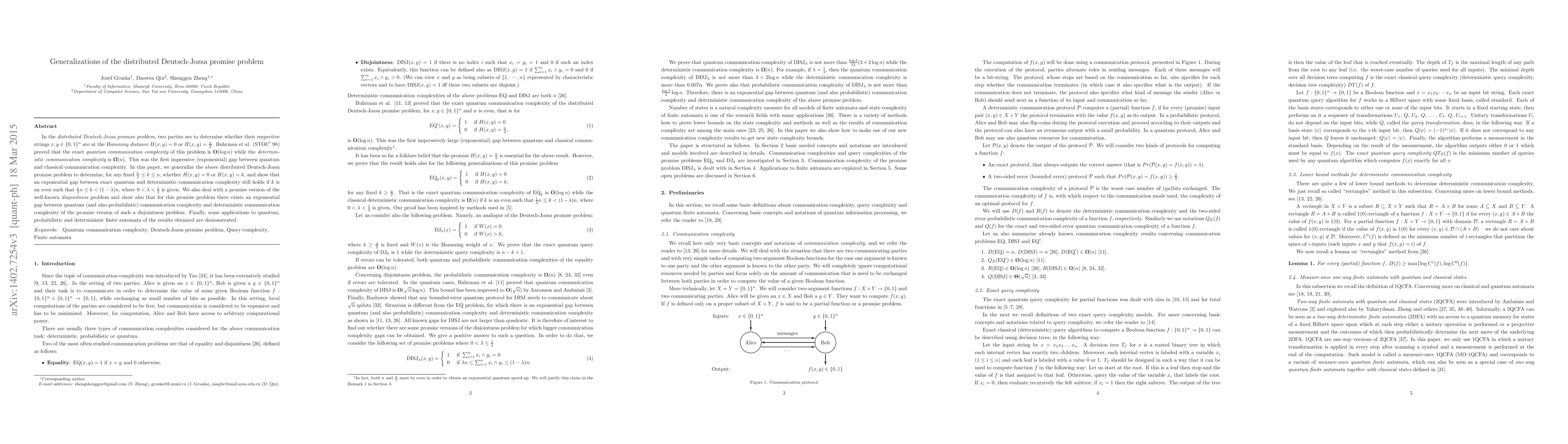 Researchers prove an exponential gap between quantum and deterministic communication complexity for a generalized version of the Deutsch-Jozsa promise problem, extending previous results to specific cases where the Hamming distance is either zero or a fraction of the string length.