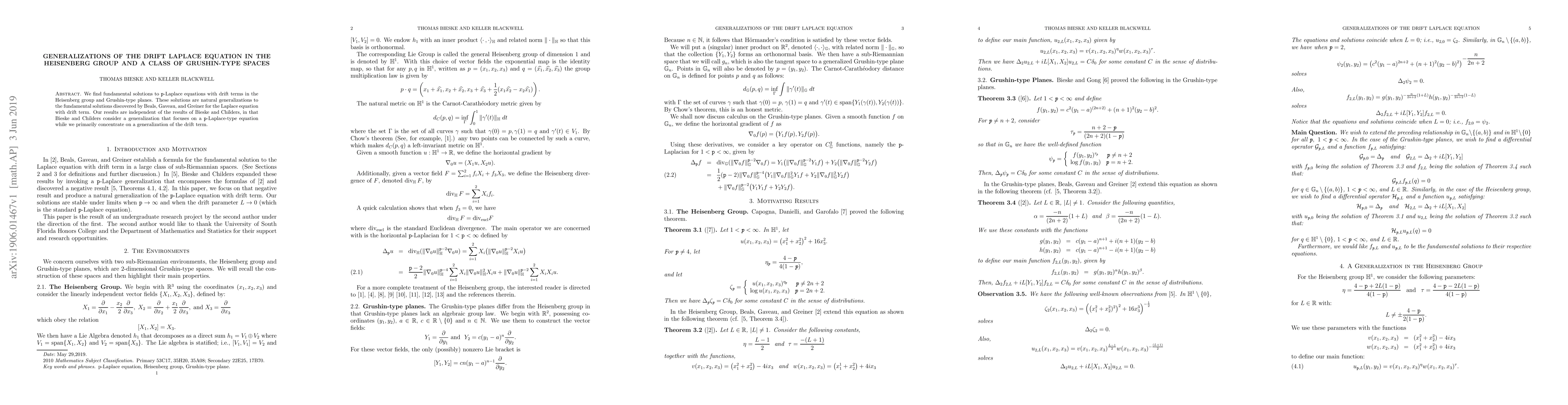 Summary: This paper discovers fundamental solutions for p-Laplace equations with drift terms in the Heisenberg group and Grushin-type spaces, extending prior results by Beals, Gaveau, and Greiner, and differs from Bieske and Childers' work by focusing on the drift term rather than the p-Laplace equation.