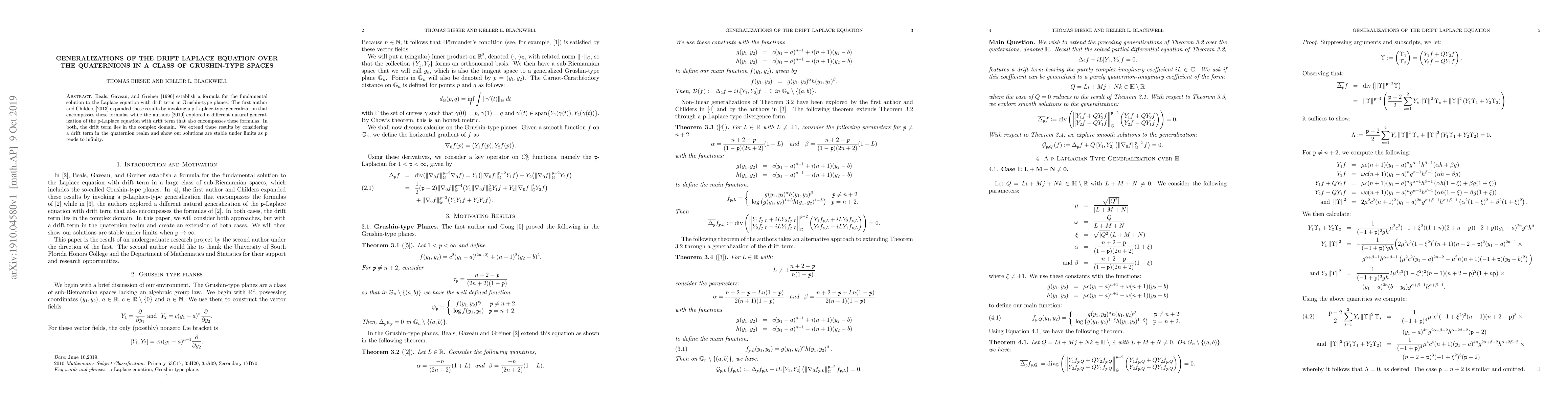 Beals, Gaveau, and Greiner in 1996 establish a formula for the fundamental solution to the Laplace equation with drift term in Grushin-type planes. The first author and Childers in 2013 expanded these results by invoking a p-Laplace-type generalization that encompasses these formulas while the authors explored a different natural generalization of the p-Laplace equation with drift term that also encompasses these formulas. In both, the drift term lies in the complex domain. We extend these results by considering a drift term in the quaternion realm and show our solutions are stable under limits as p tends to infinity.