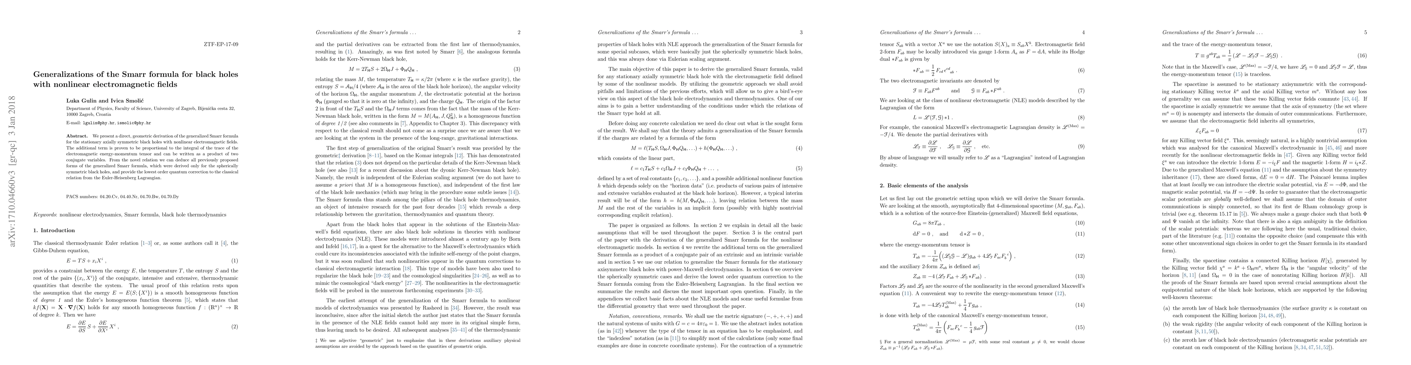 We present a direct, geometric derivation of the generalized Smarr formula for the stationary axially symmetric black holes with nonlinear electromagnetic fields. The additional term is proven to be proportional to the integral of the trace of the electromagnetic energy-momentum tensor and can be written as a product of two conjugate variables. From the novel relation we can deduce all previously proposed forms of the generalized Smarr formula, which were derived only for the spherically symmetric black holes, and provide the lowest order quantum correction to the classical relation from the Euler-Heisenberg Lagrangian.