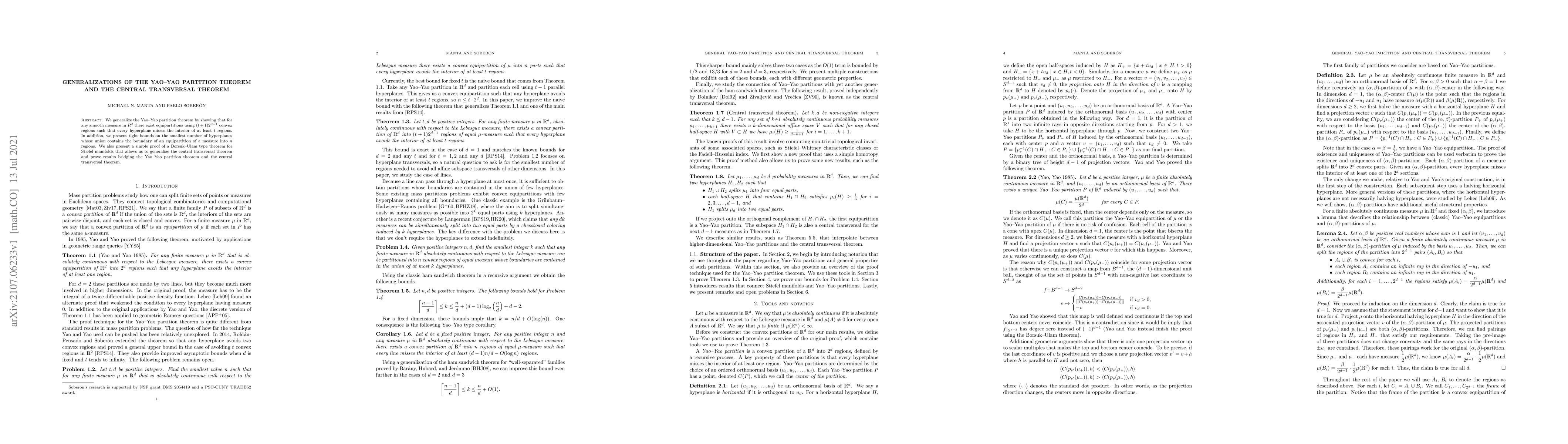 This paper generalizes the Yao-Yao partition theorem and the central transversal theorem, showing that for any smooth measure in $R^d$, there exist equipartitions using $(t+1)2^{d-1}$ convex regions with every hyperplane missing at least $t$ regions. It also provides tight bounds on the number of hyperplanes needed to cover the boundary of an equipartition and bridges results from the Yao-Yao partition theorem to the central transversal theorem.
