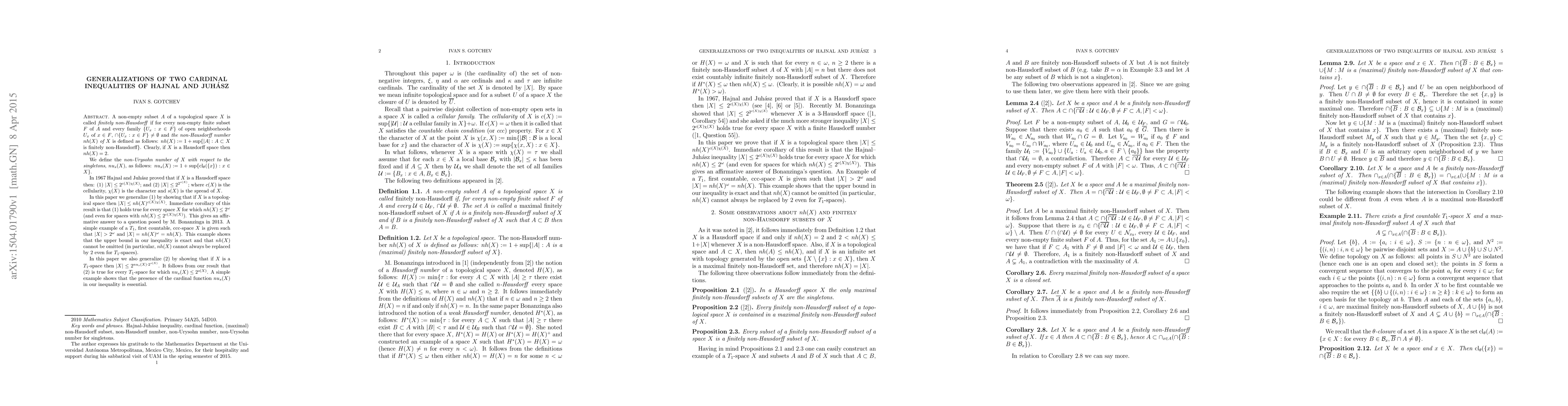 A non-empty subset $A$ of a topological space $X$ is called \emph{finitely non-Hausdorff} if for every non-empty finite subset $F$ of $A$ and every family $\{U_x:x\in F\}$ of open neighborhoods $U_x$ of $x\in F$, $\cap\{U_x:x\in F\}\ne\emptyset$ and \emph{the non-Hausdorff number $nh(X)$ of $X$} is defined as follows: $nh(X):=1+\sup\{|A|:A\subset X$ is finitely non-Hausdorff$\}$. Clearly, if $X$ is a Hausdorff space then $nh(X)=2$. We define the \emph{non-Urysohn number of $X$ with respect to the singletons}, $nu_s(X)$, as follows: $nu_s(X):=1+\sup\{\mathrm{cl}_\theta(\{x\}):x\in X\}$. In 1967 Hajnal and Juh\'asz proved that if $X$ is a Hausdorff space then: (1) $|X|\le 2^{c(X)\chi(X)}$; and (2) $|X|\le 2^{2^{s(X)}}$; where $c(X)$ is the cellularity, $\chi(X)$ is the character and $s(X)$ is the spread of $X$. In this paper we generalize (1) by showing that if $X$ is a topological space then $|X|\le nh(X)^{c(X)\chi(X)}$. Immediate corollary of this result is that (1) holds true for every space $X$ for which $nh(X)\le 2^\omega$ (and even for spaces with $nh(X)\le 2^{c(X)\chi(X)}$). This gives an affirmative answer to a question posed by M. Bonanzinga in 2013. A simple example of a $T_1$, first countable, ccc-space $X$ is given such that $|X|>2^\omega$ and $|X|=nh(X)^\omega=nh(X)$. This example shows that the upper bound in our inequality is exact and that $nh(X)$ cannot be omitted (in particular, $nh(X)$ cannot always be replaced by $2$ even for $T_1$-spaces). In this paper we also generalize (2) by showing that if $X$ is a $T_1$-space then $|X|\le 2^{nu_s(X)\cdot 2^{s(X)}}$. It follows from our result that (2) is true for every $T_1$-space for which $nu_s(X)\le 2^{s(X)}$. A simple example shows that the presence of the cardinal function $nu_s(X)$ in our inequality is essential.