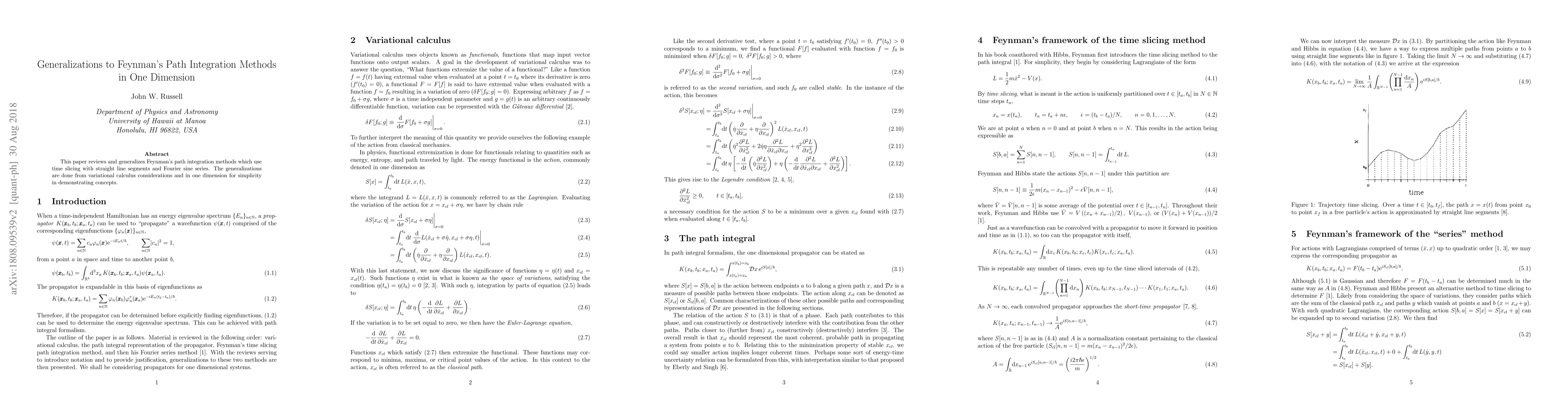 This paper reviews and generalizes Feynman's path integration methods, focusing on time slicing and Fourier sine series, and extends these concepts from variational calculus in one dimension to simplify concept demonstration.