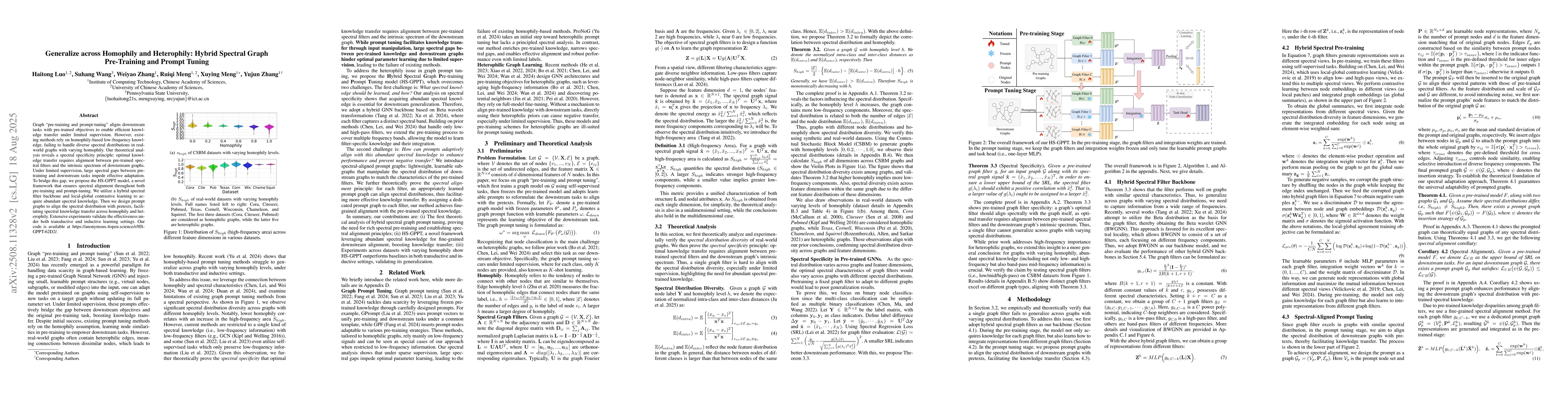 Graph ``pre-training and prompt-tuning'' aligns downstream tasks with pre-trained objectives to enable efficient knowledge transfer under limited supervision. However, existing methods rely on homophily-based low-frequency knowledge, failing to handle diverse spectral distributions in real-world graphs with varying homophily. Our theoretical analysis reveals a spectral specificity principle: optimal knowledge transfer requires alignment between pre-trained spectral filters and the intrinsic spectrum of downstream graphs. Under limited supervision, large spectral gaps between pre-training and downstream tasks impede effective adaptation. To bridge this gap, we propose the HS-GPPT model, a novel framework that ensures spectral alignment throughout both pre-training and prompt-tuning. We utilize a hybrid spectral filter backbone and local-global contrastive learning to acquire abundant spectral knowledge. Then we design prompt graphs to align the spectral distribution with pretexts, facilitating spectral knowledge transfer across homophily and heterophily. Extensive experiments validate the effectiveness under both transductive and inductive learning settings. Our code is available at https://anonymous.4open.science/r/HS-GPPT-62D2/.