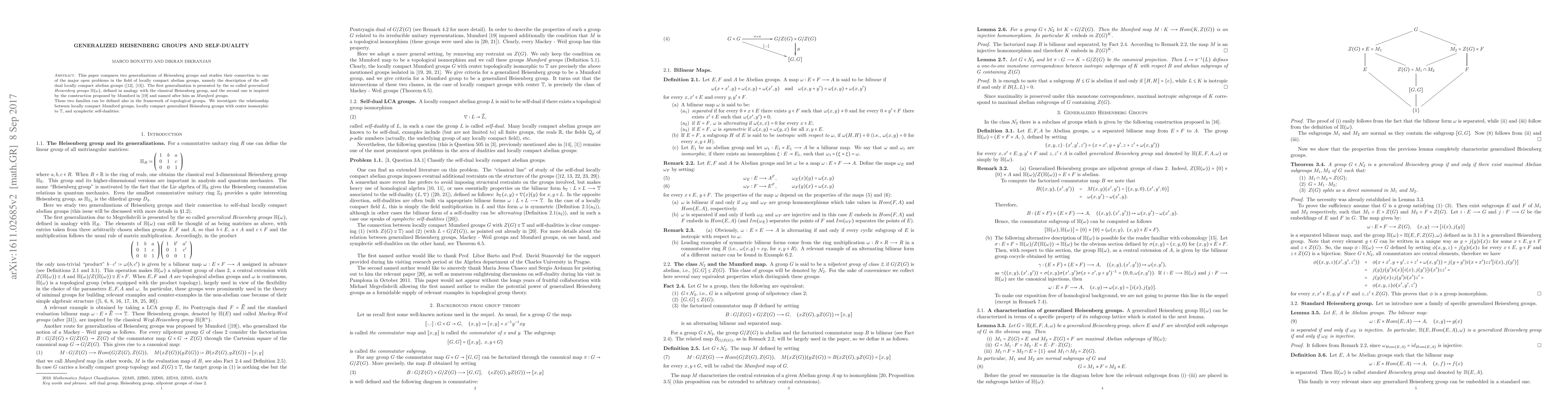 This paper compares two generalizations of Heisenberg groups and studies their connection to one of the major open problems in the field of locally compact abelian groups, namely the description of the self-dual locally compact abelian groups ([12]). The first generalization is presented by the so called generalized Heisenberg groups $\mathbb{H}(\omega)$, defined in analogy with the classical Heisenberg group and the second one is inspired by the construction proposed by Mumford in [16] and named after him as Weyl-Mumford groups (WM groups). These two families can be defined also in the framework of topological groups. We investigate the relationship between locally compact WM groups, locally compact Generalized Heisenberg with center isomorphic to $\mathbb{T}$ and symplectic self-dualities.