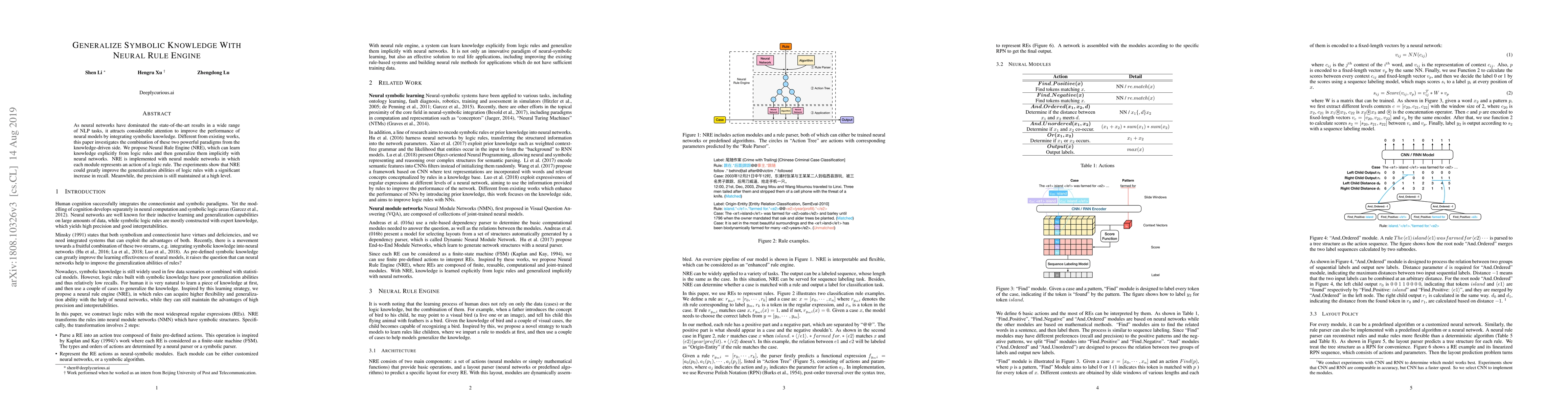 As neural networks have dominated the state-of-the-art results in a wide range of NLP tasks, it attracts considerable attention to improve the performance of neural models by integrating symbolic knowledge. Different from existing works, this paper investigates the combination of these two powerful paradigms from the knowledge-driven side. We propose Neural Rule Engine (NRE), which can learn knowledge explicitly from logic rules and then generalize them implicitly with neural networks. NRE is implemented with neural module networks in which each module represents an action of a logic rule. The experiments show that NRE could greatly improve the generalization abilities of logic rules with a significant increase in recall. Meanwhile, the precision is still maintained at a high level.