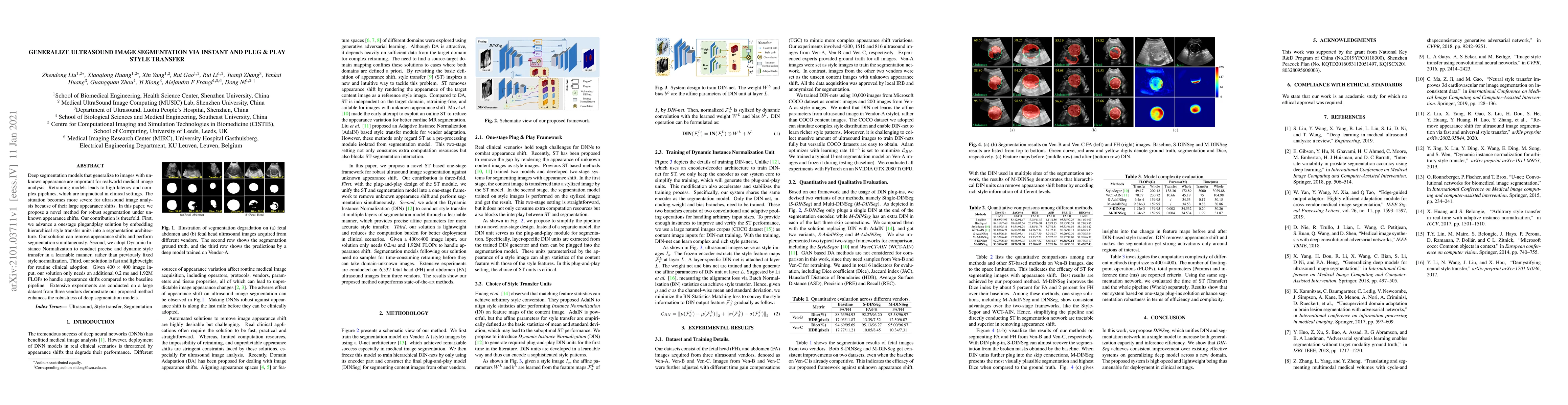 This paper proposes a novel method for robust ultrasound image segmentation by embedding hierarchical style transfer units into a segmentation architecture, enabling simultaneous removal of appearance shifts and segmentation. The method uses Dynamic Instance Normalization for precise style transfer and is lightweight, requiring only an additional 0.2ms and 1.92M FLOPs for routine clinical use.