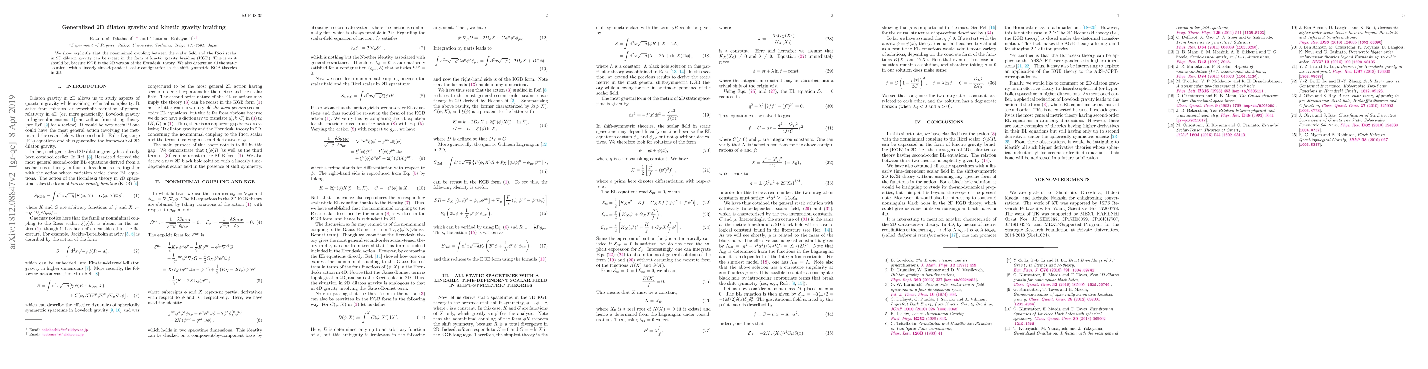Researchers show that 2D dilaton gravity can be represented as kinetic gravity braiding (KGB), a 2D version of the Horndeski theory, and find static solutions with specific scalar configurations.