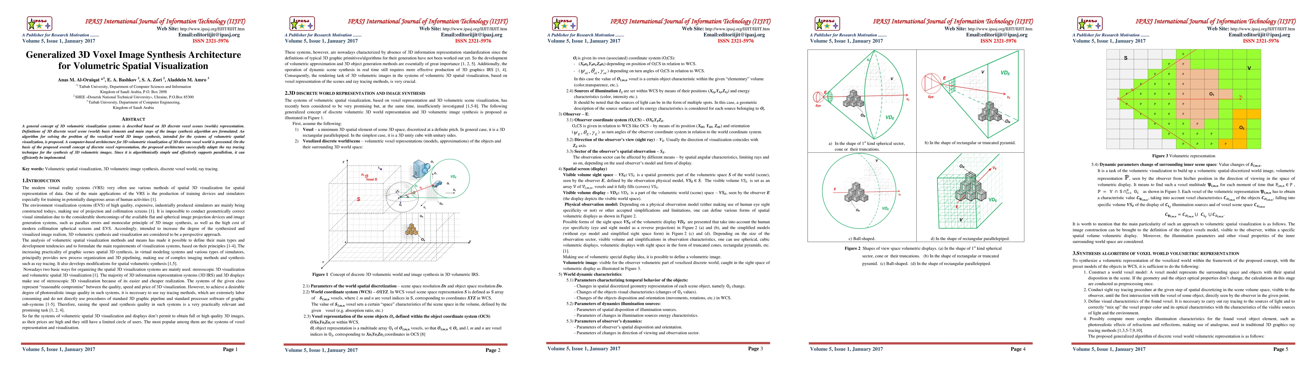 A general concept of 3D volumetric visualization systems is described based on 3D discrete voxel scenes (worlds) representation. Definitions of 3D discrete voxel scene (world) basic elements and main steps of the image synthesis algorithm are formulated. An algorithm for solving the problem of the voxelized world 3D image synthesis, intended for the systems of volumetric spatial visualization, is proposed. A computer-based architecture for 3D volumetric visualization of 3D discrete voxel world is presented. On the basis of the proposed overall concept of discrete voxel representation, the proposed architecture successfully adapts the ray tracing technique for the synthesis of 3D volumetric images. Since it is algorithmically simple and effectively supports parallelism, it can efficiently be implemented. Key words:Volumetric spatial visualization, 3D volumetric imagesynthesis, discrete voxel world, ray tracing.