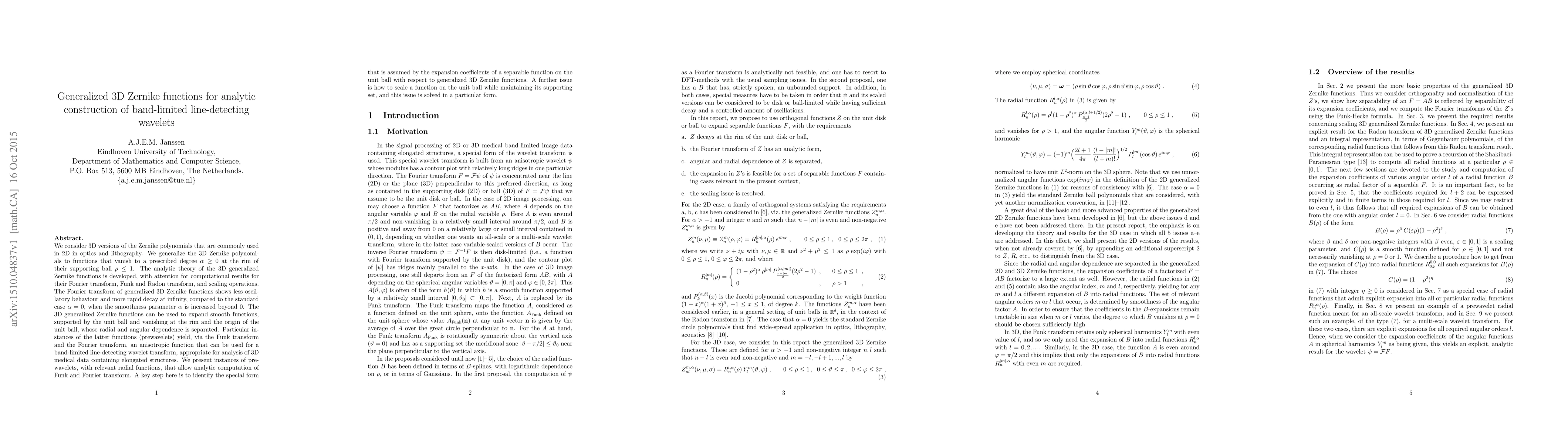 We consider 3D versions of the Zernike polynomials that are commonly used in 2D in optics and lithography. We generalize the 3D Zernike polynomials to functions that vanish to a prescribed degree $\alpha\geq0$ at the rim of their supporting ball $\rho\leq1$. The analytic theory of the 3D generalized Zernike functions is developed, with attention for computational results for their Fourier transform, Funk and Radon transform, and scaling operations. The Fourier transform of generalized 3D Zernike functions shows less oscillatory behaviour and more rapid decay at infinity, compared to the standard case $\alpha=0$, when the smoothness parameter $\alpha$ is increased beyond 0. The 3D generalized Zernike functions can be used to expand smooth functions, supported by the unit ball and vanishing at the rim and the origin of the unit ball, whose radial and angular dependence is separated. Particular instances of the latter functions (prewavelets) yield, via the Funk transform and the Fourier transform, an anisotropic function that can be used for a band-limited line-detecting wavelet transform, appropriate for analysis of 3D medical data containing elongated structures. We present instances of prewavelets, with relevant radial functions, that allow analytic computation of Funk and Fourier transform. A key step here is to identify the special form that is assumed by the expansion coefficients of a separable function on the unit ball with respect to generalized 3D Zernike functions. A further issue is how to scale a function on the unit ball while maintaining its supporting set, and this issue is solved in a particular form.