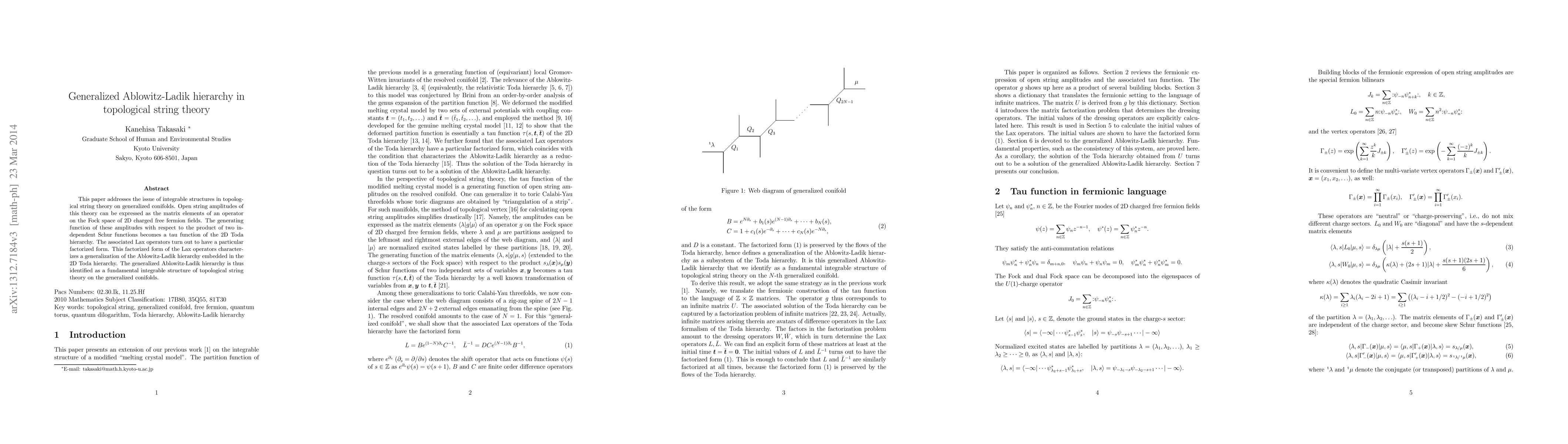 The paper presents a detailed analysis of the Lax pair formulation and the factorization of operators in the context of topological string theory, leading to the identification of a generalized Ablowitz-Ladik hierarchy as an integrable structure.