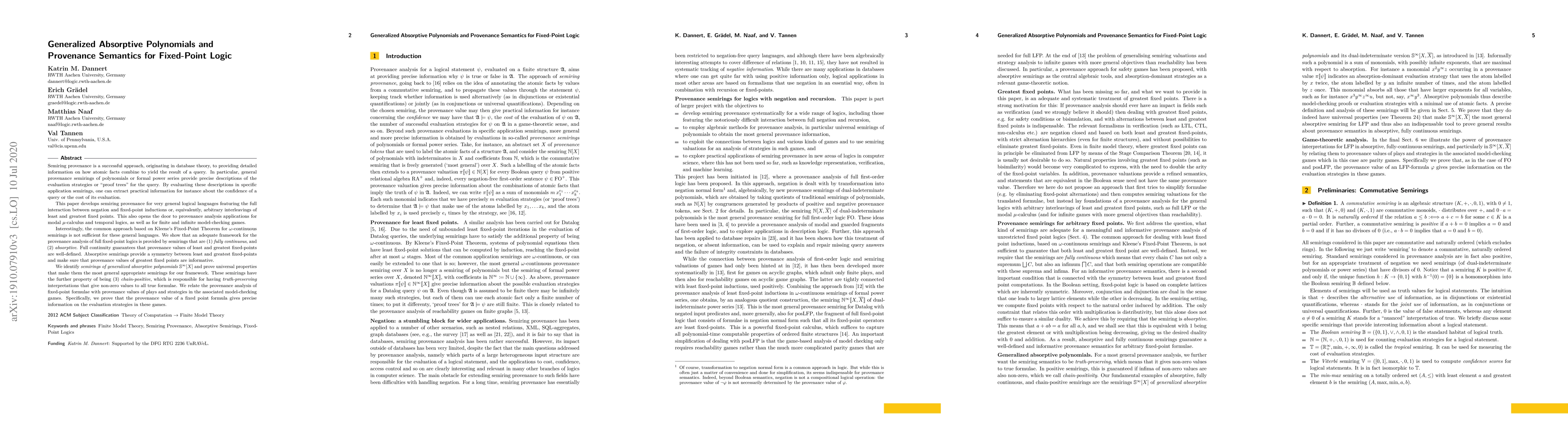 The introduction of generalized absorptive polynomials and their universal properties, along with a novel provenance semantics framework for fixed-point logic.