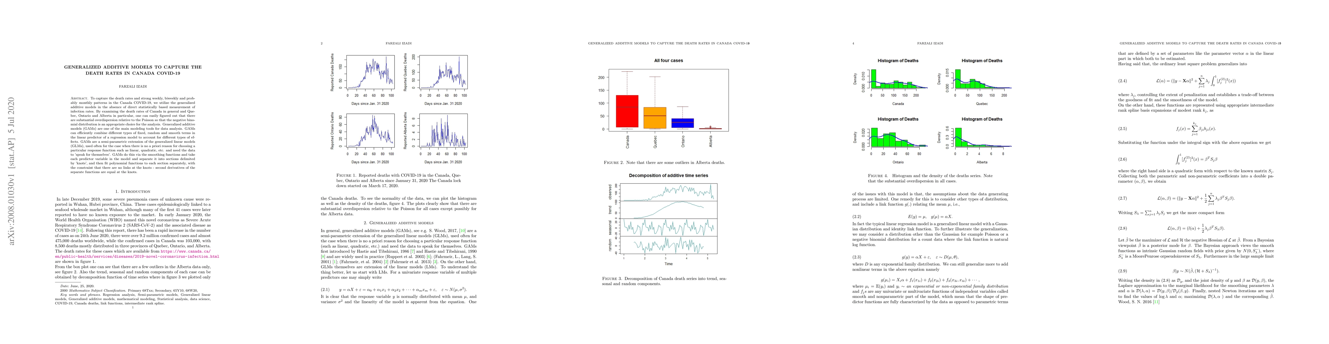 To capture the death rates and strong weekly, biweekly and probably monthly patterns in the Canada COVID-19, we utilize the generalized additive models in the absence of direct statistically based measurement of infection rates. By examining the death rates of Canada in general and Quebec, Ontario and Alberta in particular, one can easily figured out that there are substantial overdispersion relative to the Poisson so that the negative binomial distribution is an appropriate choice for the analysis. Generalized additive models (GAMs) are one of the main modeling tools for data analysis. GAMs can efficiently combine different types of fixed, random and smooth terms in the linear predictor of a regression model to account for different types of effects. GAMs are a semi-parametric extension of the generalized linear models (GLMs), used often for the case when there is no a priori reason for choosing a particular response function such as linear, quadratic, etc. and need the data to 'speak for themselves'. GAMs do this via the smoothing functions and take each predictor variable in the model and separate it into sections delimited by 'knots', and then fit polynomial functions to each section separately, with the constraint that there are no links at the knots - second derivatives of the separate functions are equal at the knots.