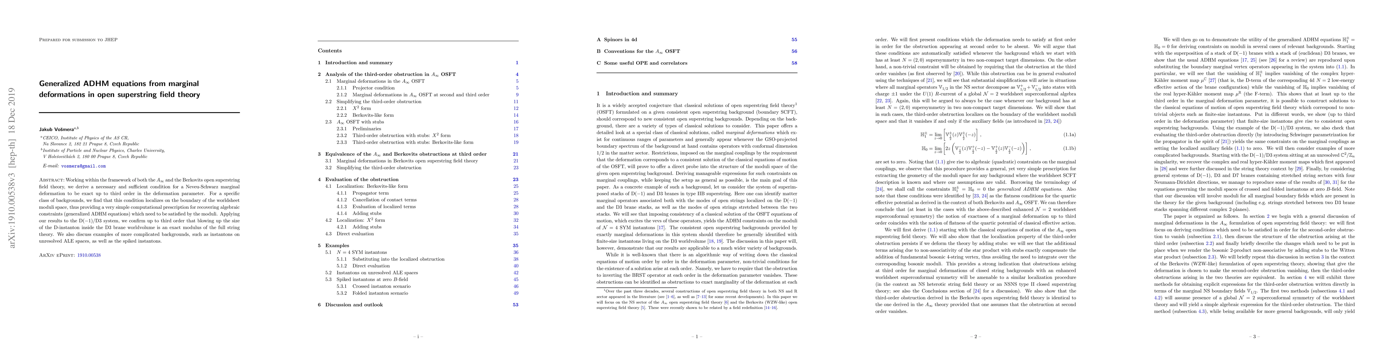 Working within the framework of both the $A_\infty$ and the Berkovits open superstring field theory, we derive a necessary and sufficient condition for a Neveu-Schwarz marginal deformation to be exact up to third order in the deformation parameter. For a specific class of backgrounds, we find that this condition localizes on the boundary of the worldsheet moduli space, thus providing a very simple computational prescription for recovering algebraic constraints (generalized ADHM equations) which need to be satisfied by the moduli. Applying our results to the $\mathrm{D(-1)/D3}$ system, we confirm up to third order that blowing up the size of the D-instanton inside the D3 brane worldvolume is an exact modulus of the full string theory. We also discuss examples of more complicated backgrounds, such as instantons on unresolved ALE spaces, as well as the spiked instantons.