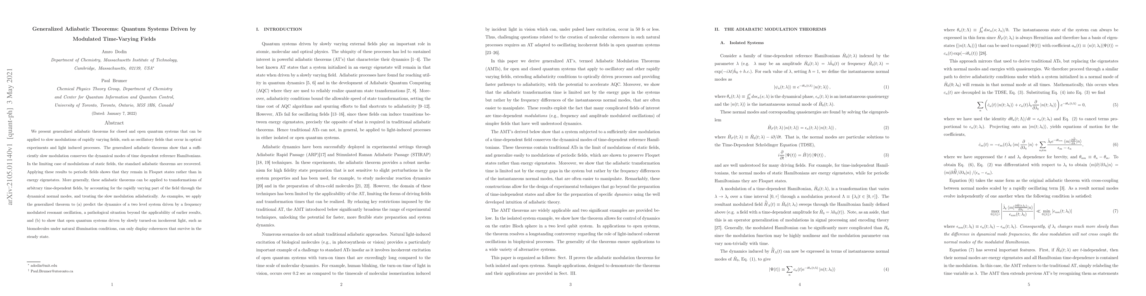 The paper introduces generalized adiabatic theorems that account for dynamical normal modes in time-dependent reference Hamiltonians, extending adiabatic theorems to rapidly varying fields with slow modulations.