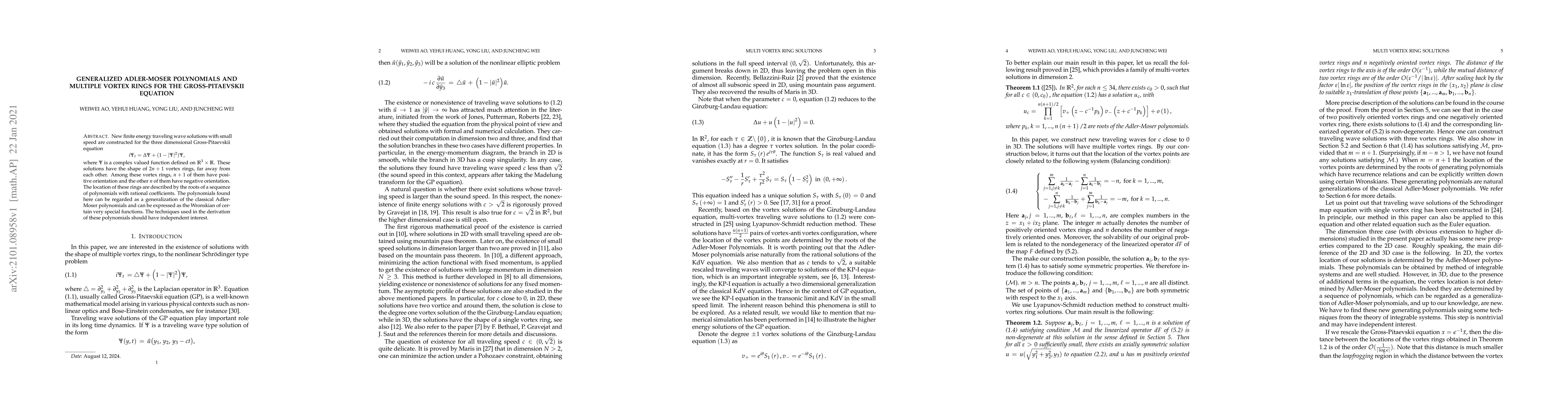 New finite energy traveling wave solutions with small speed are constructed for the three dimensional Gross-Pitaevskii equation \begin{equation*} i\Psi_t= \Delta \Psi+(1-|\Psi|^2)\Psi, \end{equation*} where $\Psi$ is a complex valued function defined on ${\mathbb R}^3\times{\mathbb R}$. These solutions have the shape of $2n+1$ vortex rings, far away from each other. Among these vortex rings, $n+1$ of them have positive orientation and the other $n$ of them have negative orientation. The location of these rings are described by the roots of a sequence of polynomials with rational coefficients. The polynomials found here can be regarded as a generalization of the classical Adler-Moser polynomials and can be expressed as the Wronskian of certain very special functions. The techniques used in the derivation of these polynomials should have independent interest.