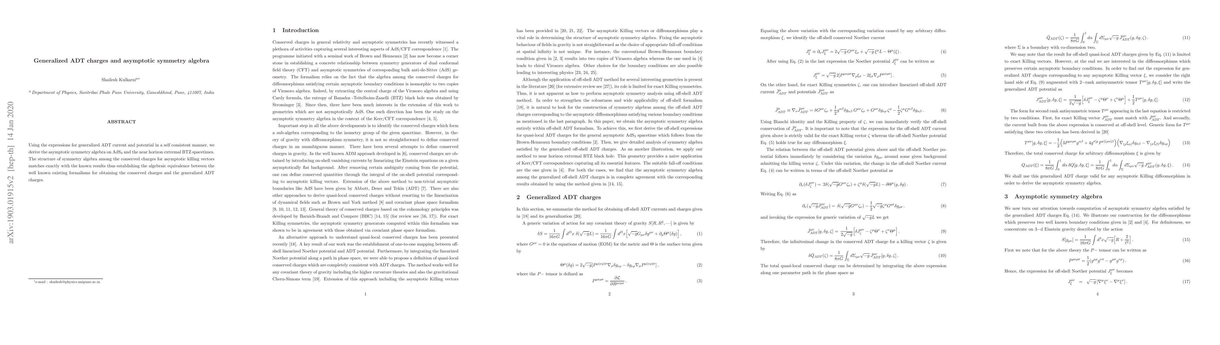 Researchers derive asymptotic symmetry algebra on AdS3 spacetimes using generalized ADT charges, confirming algebraic equivalence with existing formalisms for conserved charges.