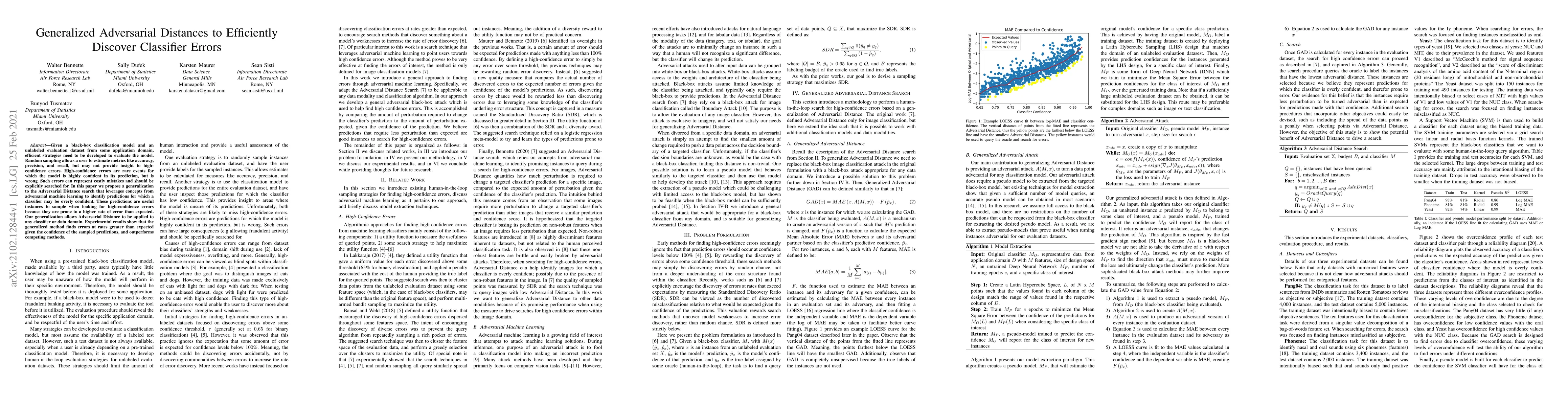 Given a black-box classification model and an unlabeled evaluation dataset from some application domain, efficient strategies need to be developed to evaluate the model. Random sampling allows a user to estimate metrics like accuracy, precision, and recall, but may not provide insight to high-confidence errors. High-confidence errors are rare events for which the model is highly confident in its prediction, but is wrong. Such errors can represent costly mistakes and should be explicitly searched for. In this paper we propose a generalization to the Adversarial Distance search that leverages concepts from adversarial machine learning to identify predictions for which a classifier may be overly confident. These predictions are useful instances to sample when looking for high-confidence errors because they are prone to a higher rate of error than expected. Our generalization allows Adversarial Distance to be applied to any classifier or data domain. Experimental results show that the generalized method finds errors at rates greater than expected given the confidence of the sampled predictions, and outperforms competing methods.