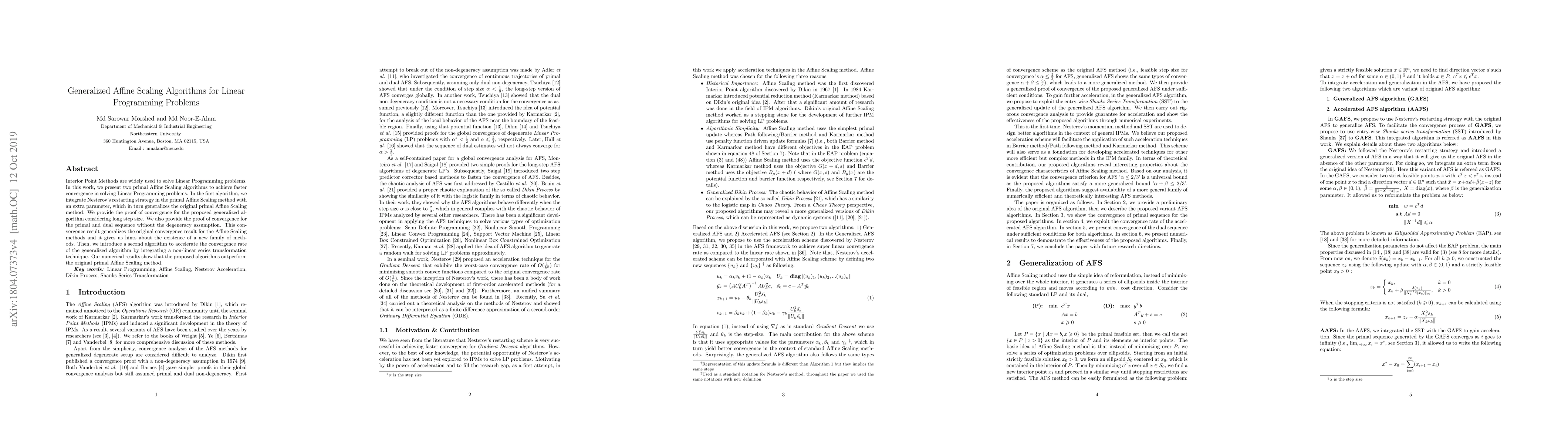 Interior Point Methods are widely used to solve Linear Programming problems. In this work, we present two primal affine scaling algorithms to achieve faster convergence in solving Linear Programming problems. In the first algorithm, we integrate Nesterov's restarting strategy in the primal affine scaling method with an extra parameter, which in turn generalizes the original primal affine scaling method. We provide the proof of convergence for the proposed generalized algorithm considering long step size. We also provide the proof of convergence for the primal and dual sequence without the degeneracy assumption. This convergence result generalizes the original convergence result for the affine scaling methods and it gives us hints about the existence of a new family of methods. Then, we introduce a second algorithm to accelerate the convergence rate of the generalized algorithm by integrating a non-linear series transformation technique. Our numerical results show that the proposed algorithms outperform the original primal affine scaling method.