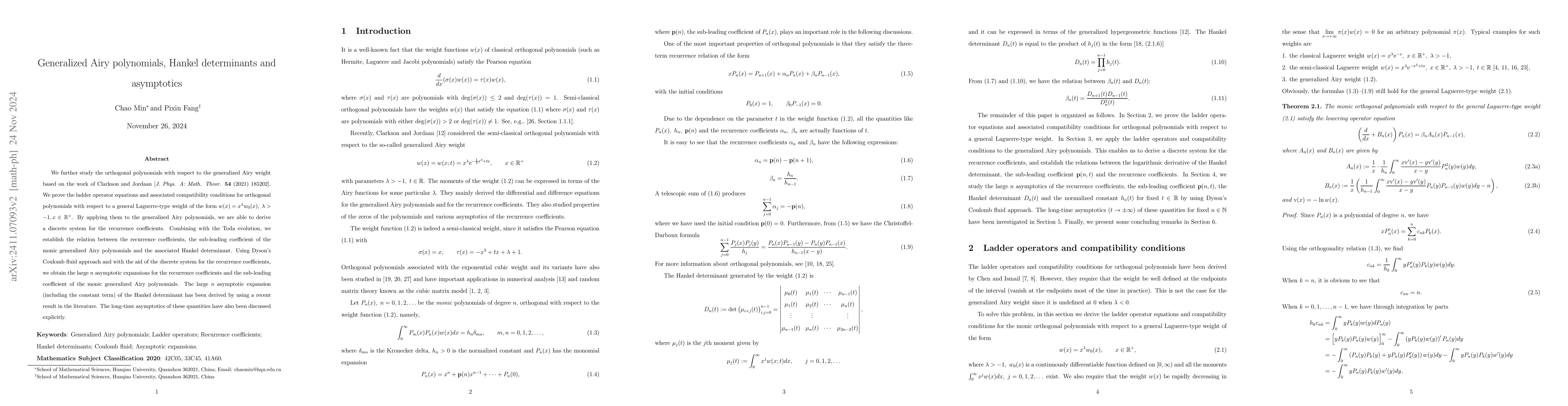 This paper studies orthogonal polynomials based on the generalized Airy weight, proving ladder operator equations and their compatibility conditions for a general Laguerre-type weight. It derives a discrete system for recurrence coefficients, connects these coefficients to the sub-leading term of generalized Airy polynomials and Hankel determinants, and uses Dyson's Coulomb fluid approach to obtain large $n$ asymptotic expansions for these quantities.