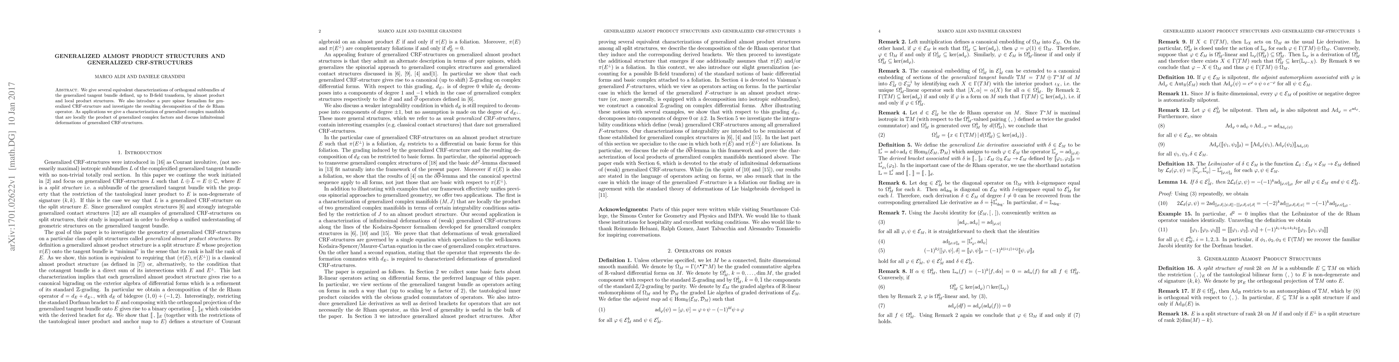 This paper provides multiple equivalent definitions for orthogonal subbundles in the generalized tangent bundle, defined by almost product and local product structures, and introduces a pure spinor formalism for generalized CRF-structures, analyzing the de Rham operator's decomposition. It also characterizes generalized complex manifolds that are locally product of generalized complex factors and explores infinitesimal deformations of generalized CRF-structures.