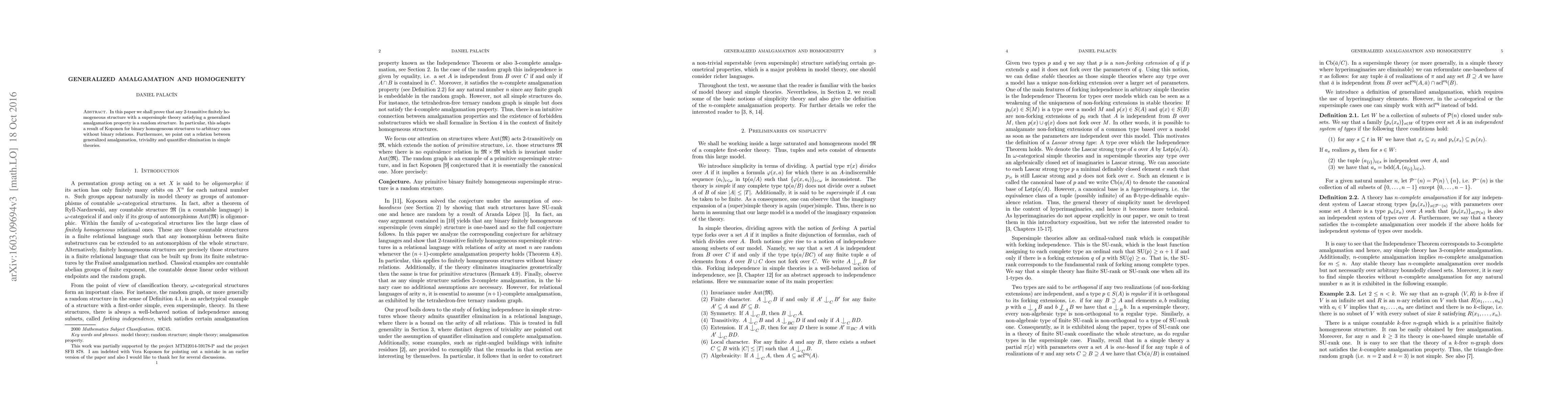 This paper proves that any $2$-transitive finitely homogeneous structure with a supersimple theory and a generalized amalgamation property is a random structure, extending Koponen's result for binary structures to all homogeneous structures. It also explores connections between generalized amalgamation, triviality, and quantifier elimination in simple theories.