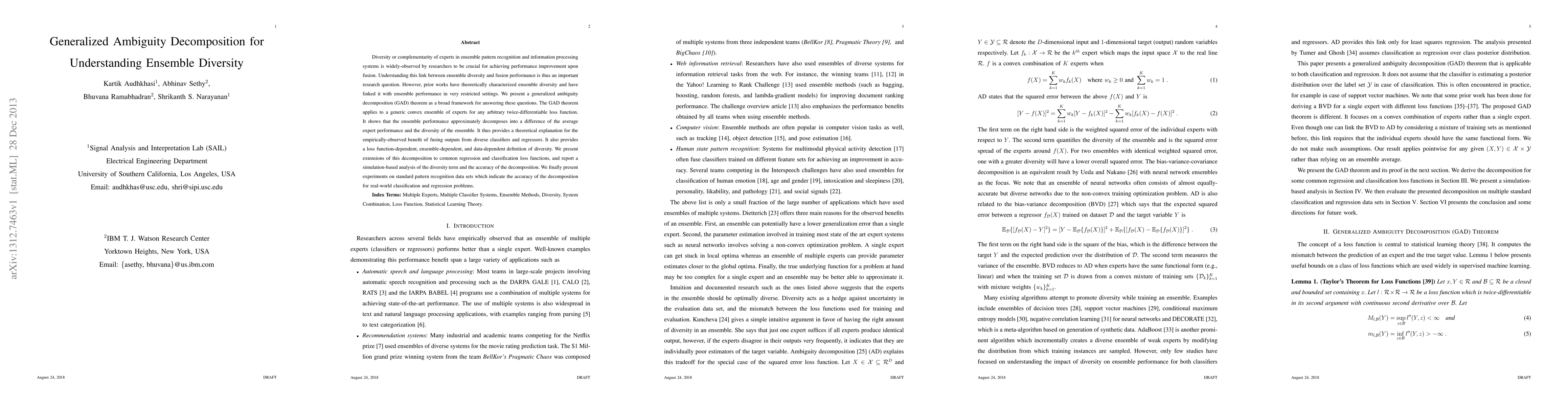 Diversity or complementarity of experts in ensemble pattern recognition and information processing systems is widely-observed by researchers to be crucial for achieving performance improvement upon fusion. Understanding this link between ensemble diversity and fusion performance is thus an important research question. However, prior works have theoretically characterized ensemble diversity and have linked it with ensemble performance in very restricted settings. We present a generalized ambiguity decomposition (GAD) theorem as a broad framework for answering these questions. The GAD theorem applies to a generic convex ensemble of experts for any arbitrary twice-differentiable loss function. It shows that the ensemble performance approximately decomposes into a difference of the average expert performance and the diversity of the ensemble. It thus provides a theoretical explanation for the empirically-observed benefit of fusing outputs from diverse classifiers and regressors. It also provides a loss function-dependent, ensemble-dependent, and data-dependent definition of diversity. We present extensions of this decomposition to common regression and classification loss functions, and report a simulation-based analysis of the diversity term and the accuracy of the decomposition. We finally present experiments on standard pattern recognition data sets which indicate the accuracy of the decomposition for real-world classification and regression problems.