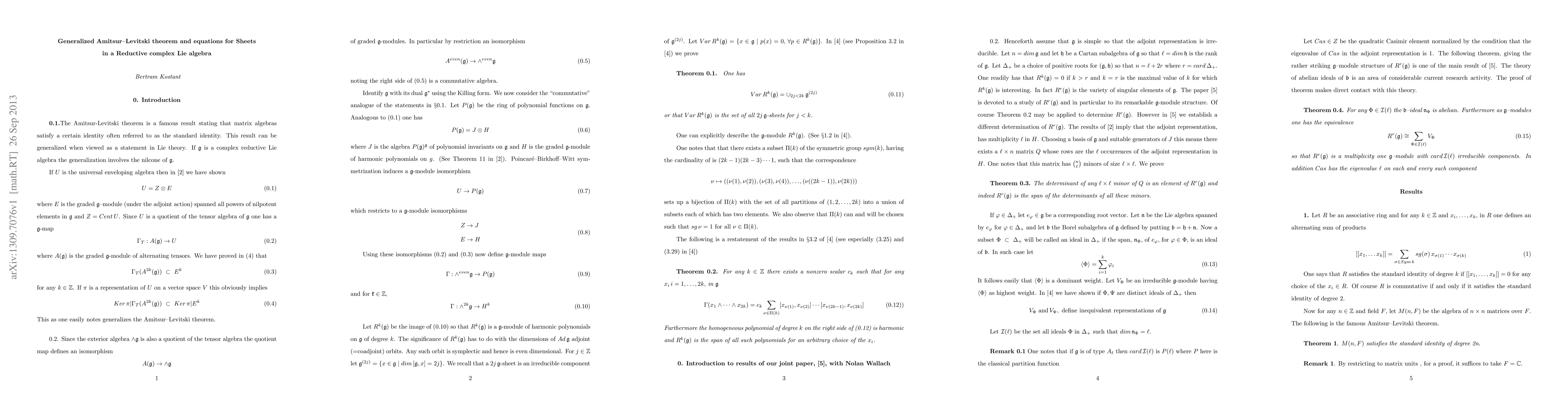 Summary: This paper extends the Amitsur-Levitski theorem to a generalized Lie algebra context and links these extensions to equations defining sheets within a reductive complex Lie algebra, also connecting with Kostant-Wallach's findings on singular elements.