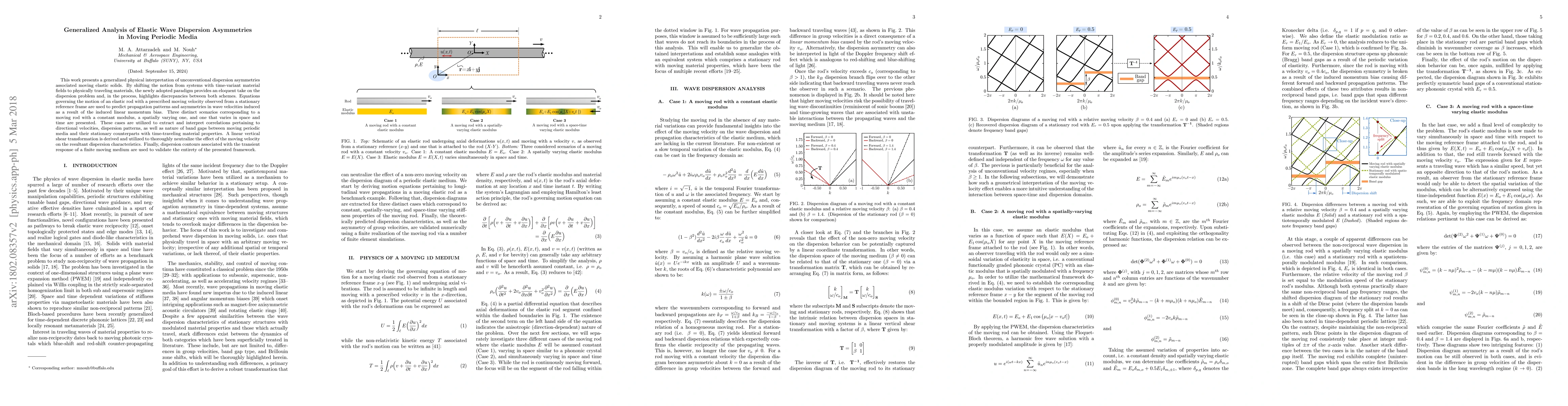 This paper generalizes the analysis of elastic wave dispersion asymmetries in moving periodic media, shifting focus from time-variant material fields to physically traveling materials. It predicts wave propagation patterns and asymmetries using equations for an elastic rod's motion, examining three scenarios to highlight differences between moving and stationary media, and validates the framework with dispersion contours.