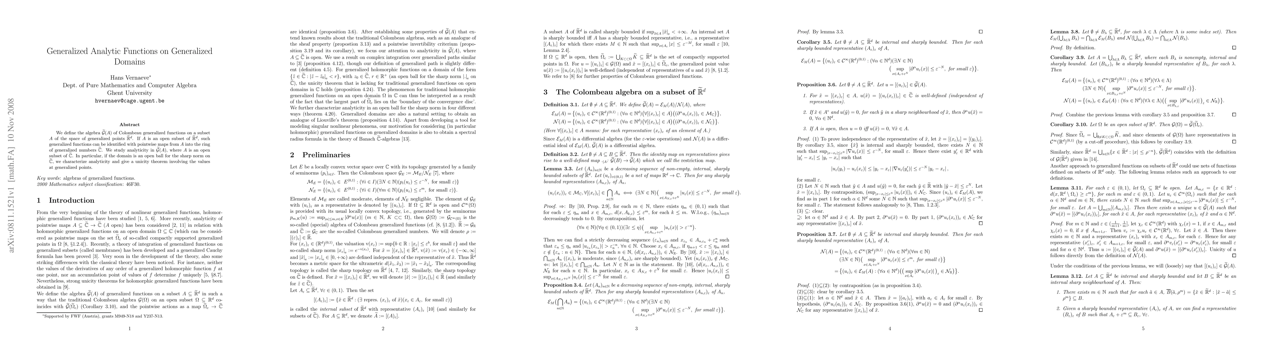 The paper defines the algebra of Colombeau generalized functions on a subset A of the space of d-dimensional generalized points, studying analyticity in these algebras when the domain is an open subset of the complex generalized points, particularly focusing on open balls for the sharp norm.
