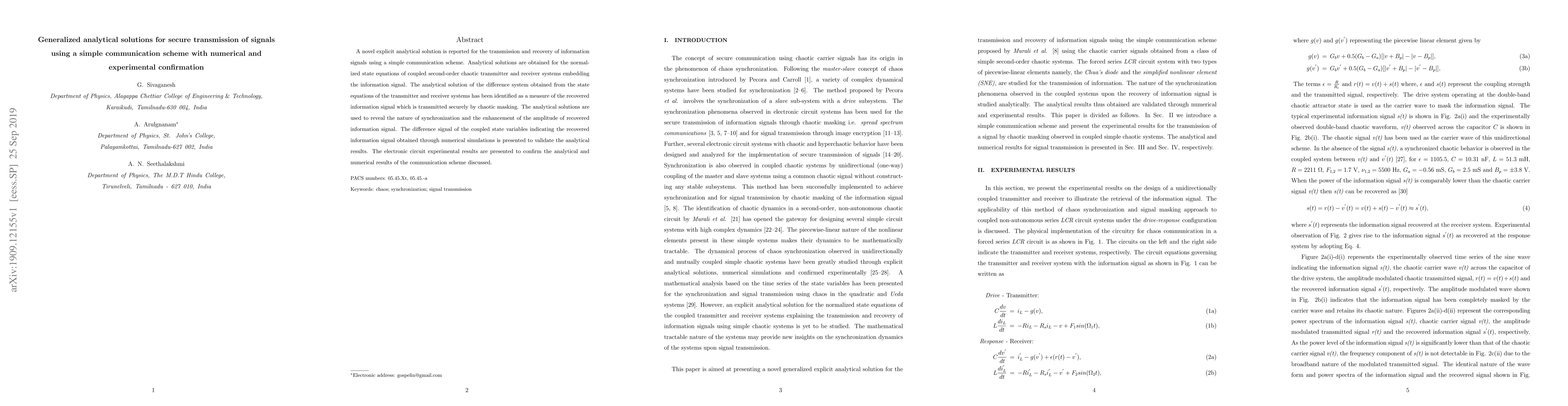 A novel explicit analytical solution is reported for the transmission and recovery of information signals using a simple communication scheme. Analytical solutions are obtained for the normalized state equations of coupled second-order chaotic transmitter and receiver systems embedding the information signal. The analytical solution of the difference system obtained from the state equations of the transmitter and receiver systems has been identified as a measure of the recovered information signal which is transmitted securely by chaotic masking. The analytical solutions are used to reveal the nature of synchronization and the enhancement of the amplitude of recovered information signal. The difference signal of the coupled state variables indicating the recovered information signal obtained through numerical simulations is presented to validate the analytical results. The electronic circuit experimental results are presented to confirm the analytical and numerical results of the communication scheme discussed.