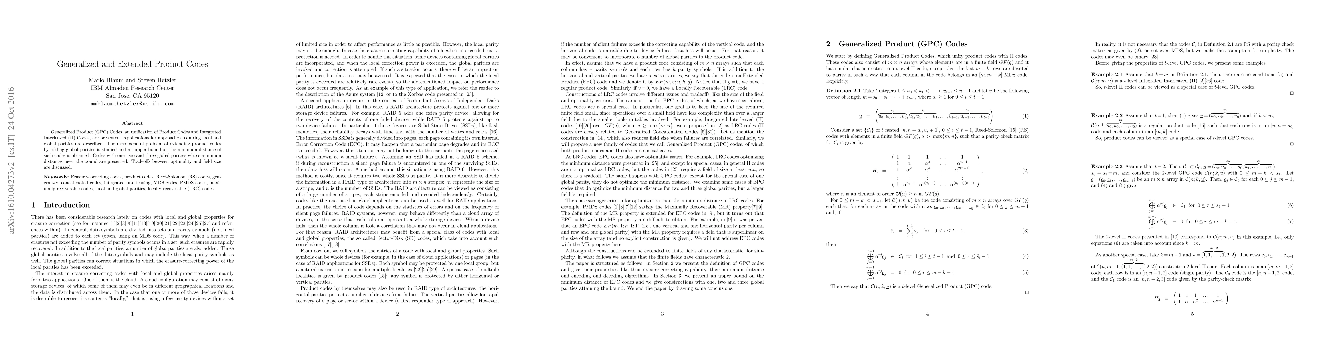 Generalized Product (GPC) Codes, an unification of Product Codes and Integrated Interleaved (II) Codes, are presented. Applications for approaches requiring local and global parities are described. The more general problem of extending product codes by adding global parities is studied and an upper bound on the minimum distance of such codes is obtained. Codes with one, two and three global parities whose minimum distances meet the bound are presented. Tradeoffs between optimality and field size are discussed.