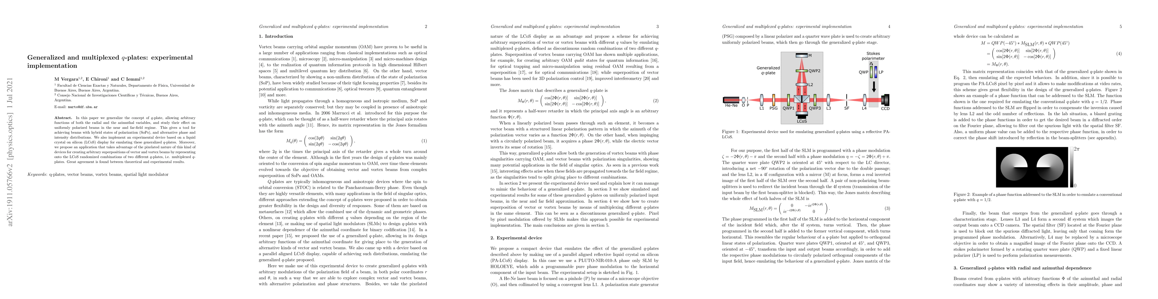 In this paper we generalize the concept of $q$-plate, allowing arbitrary functions of both the radial and the azimuthal variables, and study their effect on uniformly polarized beams in the near and far-field regime. This gives a tool for achieving beams with hybrid states of polarization (SoPs), and alternative phase and intensity distributions. We also implement an experimental device based on a liquid crystal on silicon (LCoS) display for emulating these generalized $q$-plates. Moreover, we propose an application that takes advantage of the pixelated nature of this kind of devices for creating arbitrary superpositions of vector and vortex beams by representing onto the LCoS randomized combinations of two different $q$-plates, i.e. multiplexed $q$-plates. Great agreement is found between theoretical and experimental results.