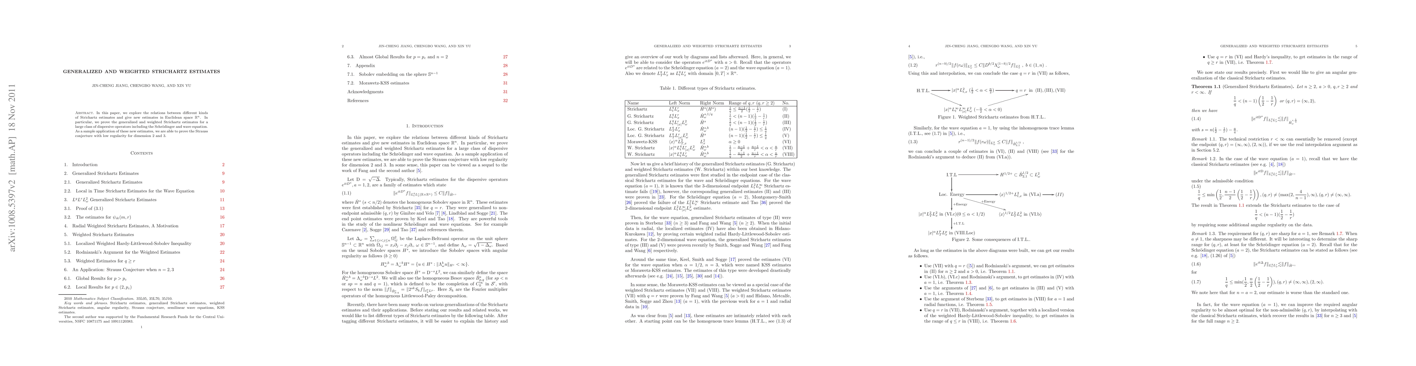 In this paper, we explore the relations between different kinds of Strichartz estimates and give new estimates in Euclidean space $\mathbb{R}^n$. In particular, we prove the generalized and weighted Strichartz estimates for a large class of dispersive operators including the Schr\"odinger and wave equation. As a sample application of these new estimates, we are able to prove the Strauss conjecture with low regularity for dimension 2 and 3.