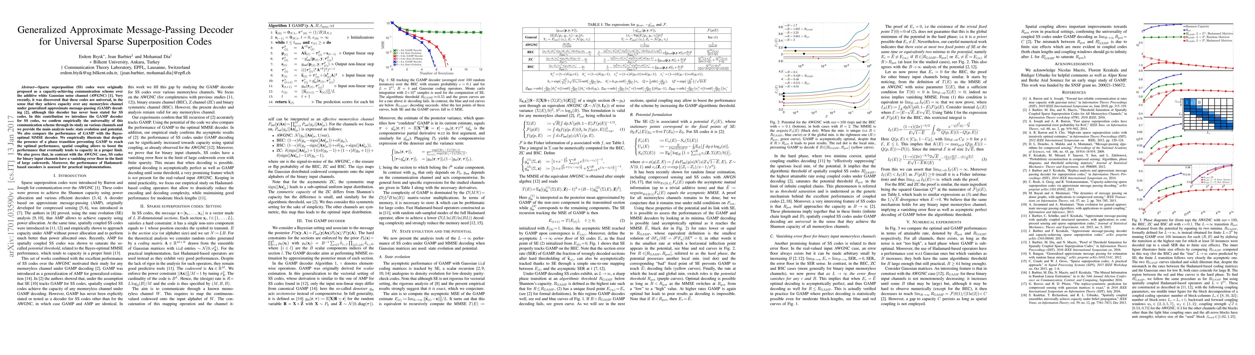 This paper introduces a generalized approximate message-passing decoder for sparse superposition codes, confirming their universality across various channels. It demonstrates that despite a phase transition, spatial coupling can enhance performance, approaching capacity limits, and provides analysis tools like state evolution and potential.
