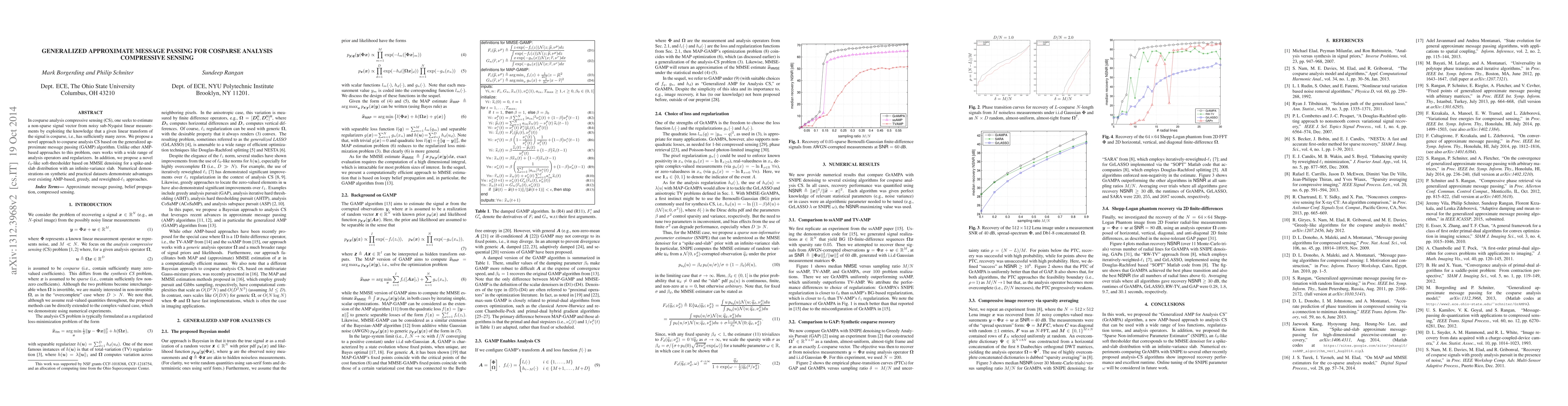 This paper proposes a novel generalized approximate message passing (GAMP) algorithm for cosparse analysis in compressive sensing, offering flexibility with various analysis operators and regularizers. It introduces a new $\ell_0$-like soft-thresholder based on MMSE denoising, demonstrating superior performance over existing AMP-based, greedy, and reweighted-$\ell_1$ methods through numerical experiments.