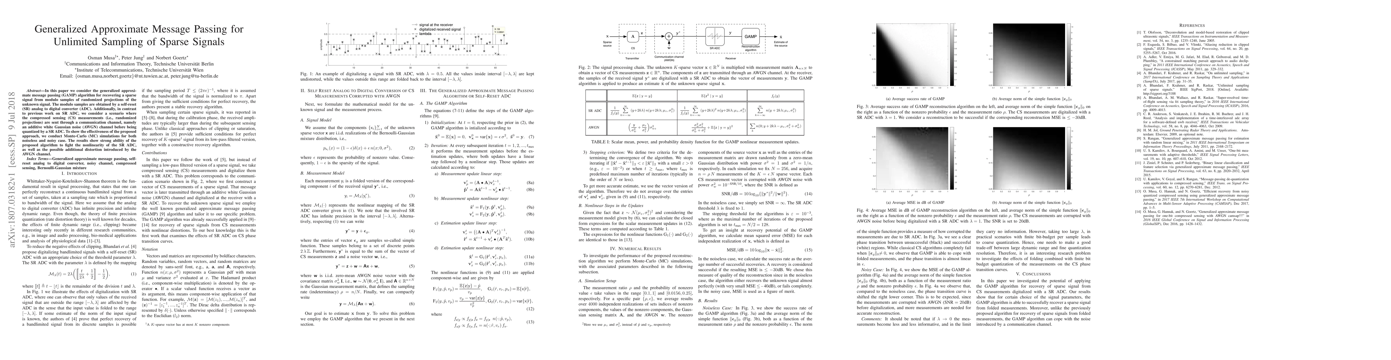 A new algorithm called Generalized Approximate Message Passing recovers sparse signals from noisy measurements sent through an AWGN channel and processed by a self-reset ADC. It effectively fights the nonlinearity of the ADC and additional distortion introduced by the AWGN.