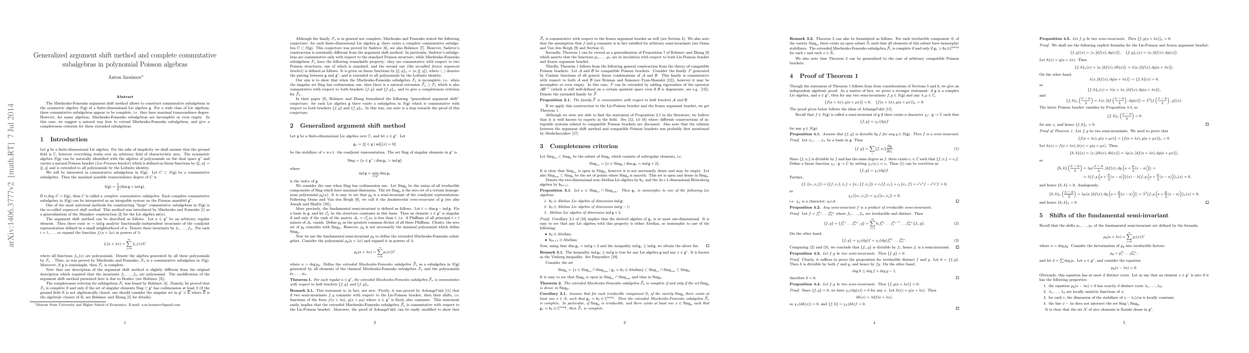 Summary: This paper extends the Mischenko-Fomenko argument shift method to construct complete commutative subalgebras in polynomial Poisson algebras, providing a criterion for ensuring the maximal transcendence degree of these subalgebras.