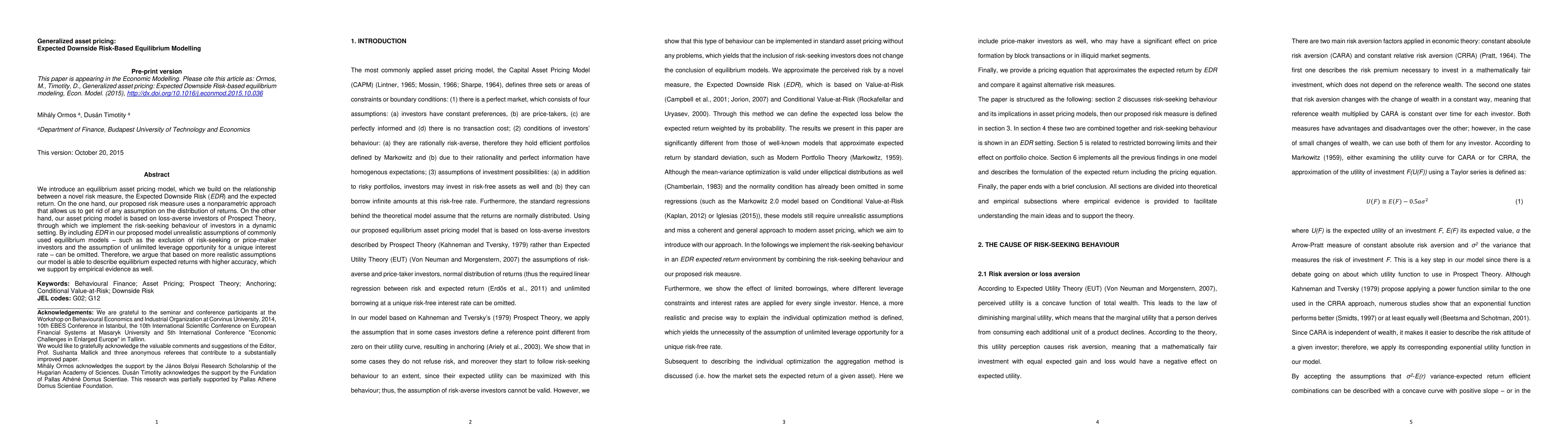 This paper presents an equilibrium asset pricing model based on Expected Downside Risk (EDR) and loss-averse investors from Prospect Theory. It eliminates distribution assumptions and unrealistic model features, aiming for higher accuracy in describing equilibrium expected returns, supported by empirical evidence.