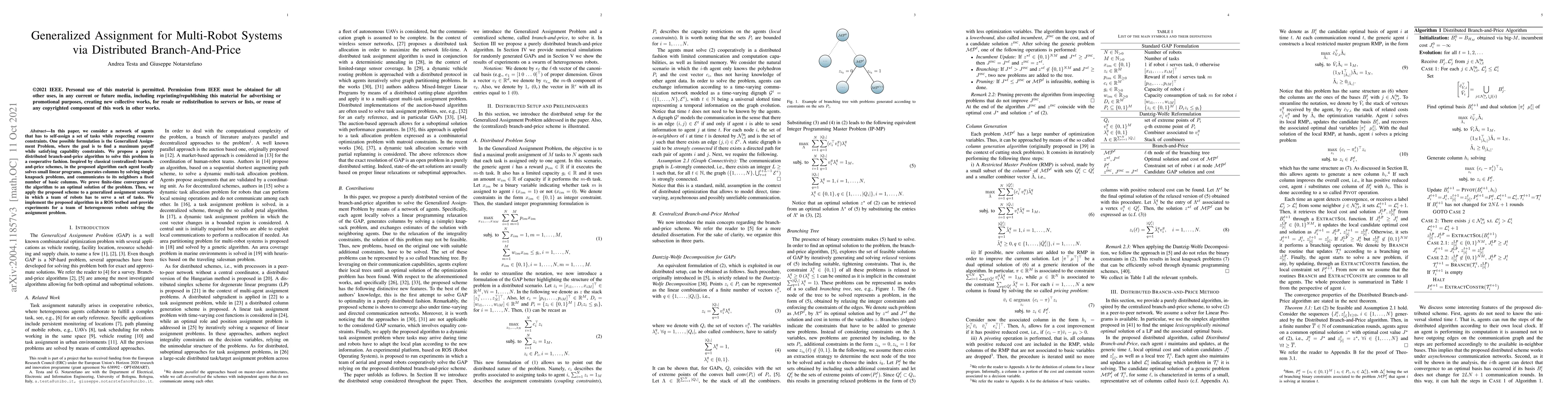 A distributed branch-and-price algorithm is proposed to solve the Generalized Assignment Problem in a network of cooperative robots, achieving finite-time convergence to an optimal solution, with promising results demonstrated on a ROS testbed.