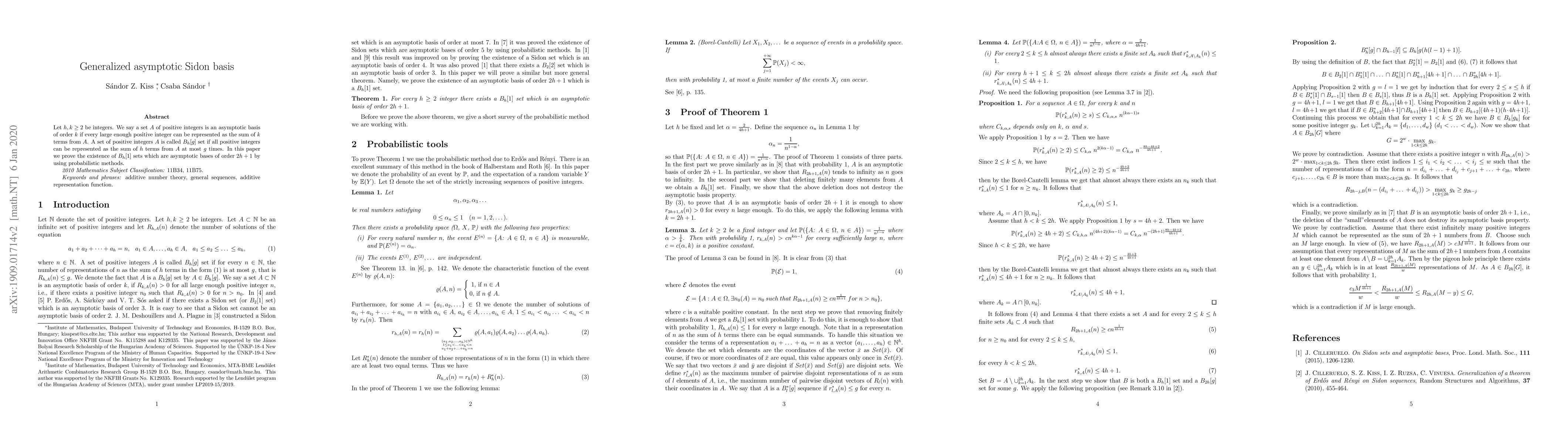 Let $h,k \ge 2$ be integers. We say a set $A$ of positive integers is an asymptotic basis of order $k$ if every large enough positive integer can be represented as the sum of $k$ terms from $A$. A set of positive integers $A$ is called $B_{h}[g]$ set if all positive integers can be represented as the sum of $h$ terms from $A$ at most $g$ times. In this paper we prove the existence of $B_{h}[1]$ sets which are asymptotic bases of order $2h+1$ by using probabilistic methods.