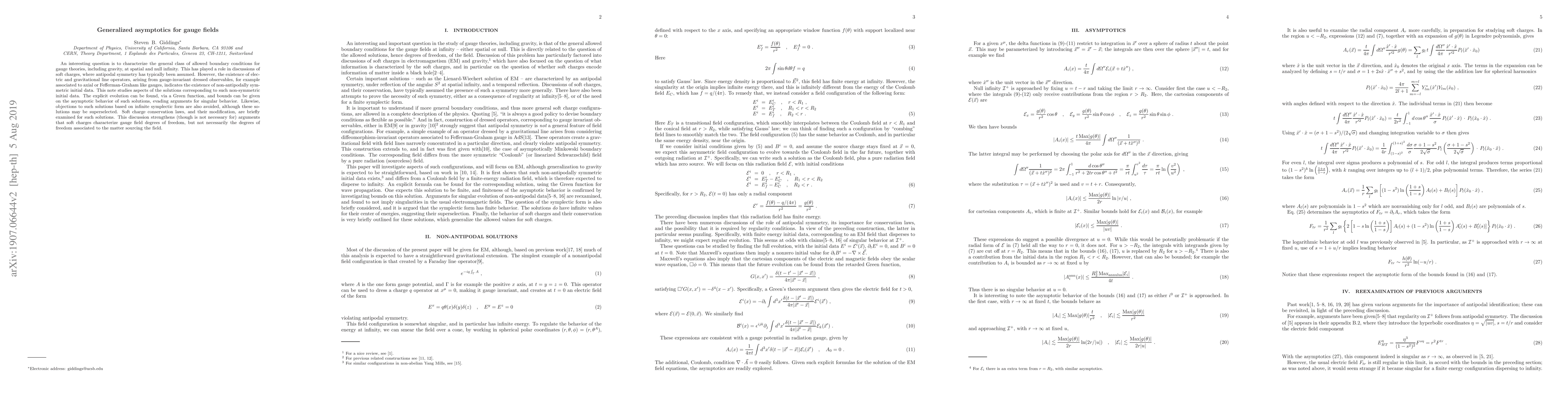 An interesting question is to characterize the general class of allowed boundary conditions for gauge theories, including gravity, at spatial and null infinity. This has played a role in discussions of soft charges, where antipodal symmetry has typically been assumed. However, the existence of electric and gravitational line operators, arising from gauge-invariant dressed observables, for example associated to axial or Fefferman-Graham like gauges, indicates the existence of non-antipodally symmetric initial data. This note studies aspects of the solutions corresponding to such non-symmetric initial data. The explicit evolution can be found, via a Green function, and bounds can be given on the asymptotic behavior of such solutions, evading arguments for singular behavior. Likewise, objections to such solutions based on infinite symplectic form are also avoided, although these solutions may be superselected. Soft charge conservation laws, and their modification, are briefly examined for such solutions. This discussion strengthens (though is not necessary for) arguments that soft charges characterize gauge field degrees of freedom, but not necessarily the degrees of freedom associated to the matter sourcing the field.