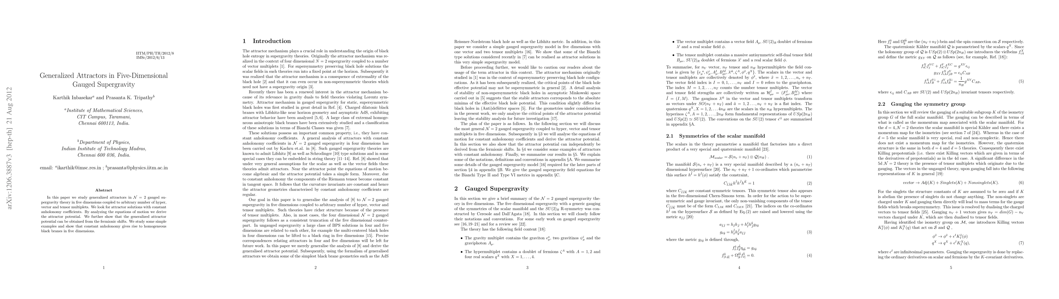 This paper investigates generalized attractors in five-dimensional N=2 gauged supergravity, deriving the attractor potential and demonstrating its relation to fermionic shifts. It finds that constant anholonomy coefficients lead to homogeneous black brane solutions in five dimensions.