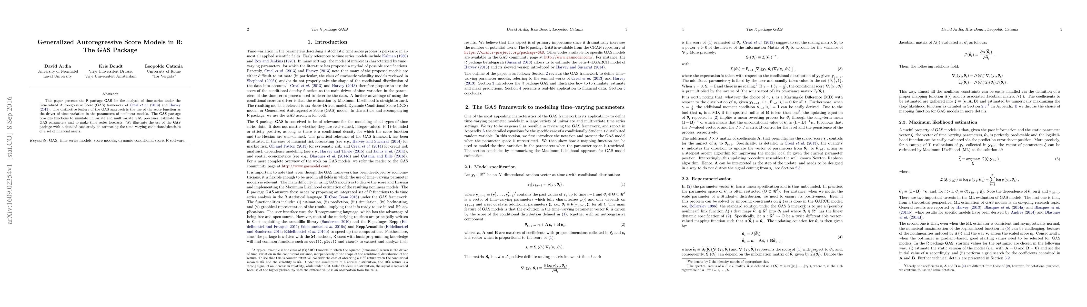 This paper presents the R package GAS for the analysis of time series under the Generalized Autoregressive Score (GAS) framework of Creal et al. (2013) and Harvey (2013). The distinctive feature of the GAS approach is the use of the score function as the driver of time-variation in the parameters of nonlinear models. The GAS package provides functions to simulate univariate and multivariate GAS processes, estimate the GAS parameters and to make time series forecasts. We illustrate the use of the GAS package with a detailed case study on estimating the time-varying conditional densities of a set of financial assets.
