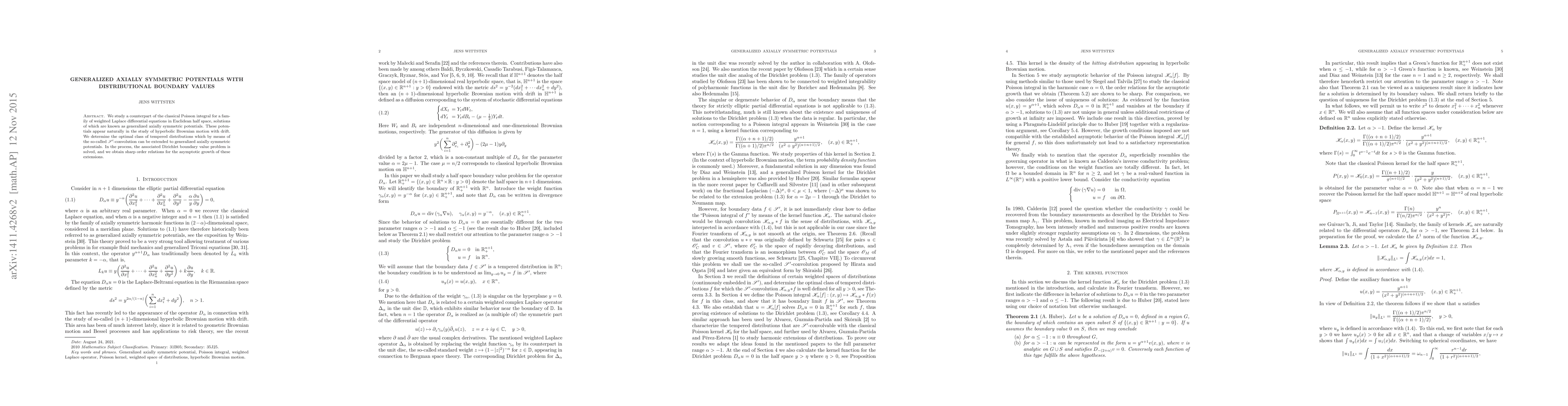 We study a counterpart of the classical Poisson integral for a family of weighted Laplace differential equations in Euclidean half space, solutions of which are known as generalized axially symmetric potentials. These potentials appear naturally in the study of hyperbolic Brownian motion with drift. We determine the optimal class of tempered distributions which by means of the so-called $\mathscr{S}'$-convolution can be extended to generalized axially symmetric potentials. In the process, the associated Dirichlet boundary value problem is solved, and we obtain sharp order relations for the asymptotic growth of these extensions.